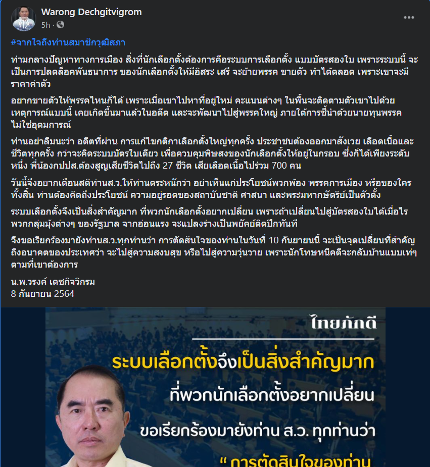 เมื่อวันที่ 8 ก.ย.2564 นพ.วรงค์ เดชกิจวิกรม หรือ หมอวรงค์ รักษาการหัวหน้าพรรคไทยภักดีได้โพสต์ข้อความผ่านทางเฟซบุคในหัวข้อ จากใจถึงท่านสมาชิกวุฒิสภา เกี่ยวกับการแก้ไขรัฐธรรมนูญรายมาตราเรื่องบัตรเลือกตั้ง ส.ส. 2 ใบ ที่รัฐสภาจะลงมติในวาระ 3 วันที่ 10 ก.ย .2564นี้ โดยการลงมติดังกล่าวมีตัวแปรสำคัญคือเสียงเห็นชอบจากสมาชิกวุฒิสภา ที่ต้องลงมติเห็นชอบด้วยไม่น้อยกว่า 84 เสียง หรือ 1 ใน 3 ของจำนวนสมาชิกวุฒิสภา 250 คน ที่จะมีขึ้นในวันพรุ่งนี้ (9 ก.ย. 2564)