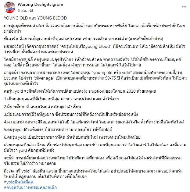 ถึงเวลาที่”yold” ต้องตื่น และลุกขึ้นมาดูแลประเทศไทยได้แล้ว อย่าปล่อยให้คนบางกลุ่ม มาครอบงำคนรุ่นใหม่ที่เป็นลูกหลาน เดินไปในทิศทางที่ผิดอีกเลย”