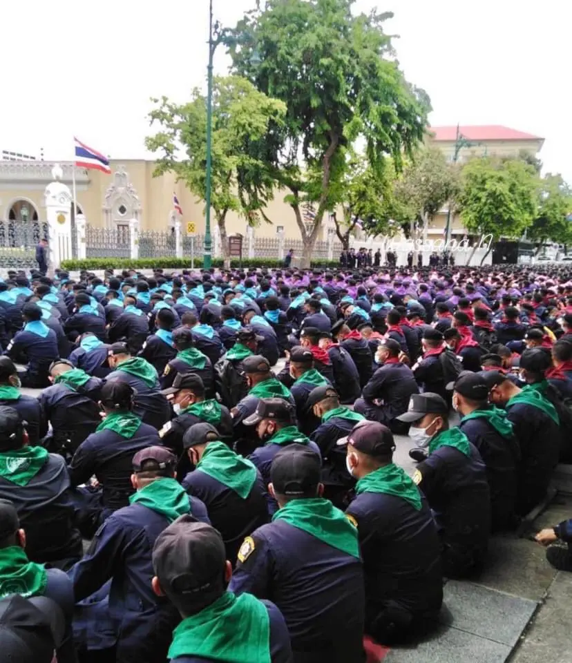 ตำรวจ ผ้าพันคอหลากสี ที่มาดูแลรอบทำเนียบฯตามแผนป้องกัน ถ.ราชดำเนิน-ลานพระราชวังดุสิต รวมพลข้างทำเนียบฯรับทราบคำสั่งถอนกำลัง