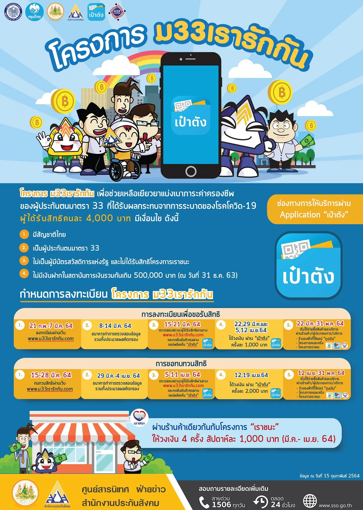 ผู้ได้รับสิทธิ์สามารถตรวจสอบสถานะผู้ได้รับสิทธิ ผ่านทาง www.ม33เรารักกัน.com และกดยืนยันตัวตนผ่านช่องทาง Application “เป๋าตัง” ได้ภายในวันที่ 15-21 มีนาคม 2564 ในการนี้ ผู้ประกันตนจะได้รับวงเงินผ่าน Application “เป๋าตัง รวม 4,000 บาท แบ่งโอนเป็น 4 งวด งวดละ 1,000 บาท