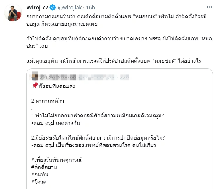 “อยากถามคุณอนุทินว่า คุณศักดิ์สยามติดตั้งแอพ “หมอชนะ” หรือไม่ ถ้าติดตั้งก็จะมีข้อมูล ก็ควรเอาข้อมูลมาเปิดเผย