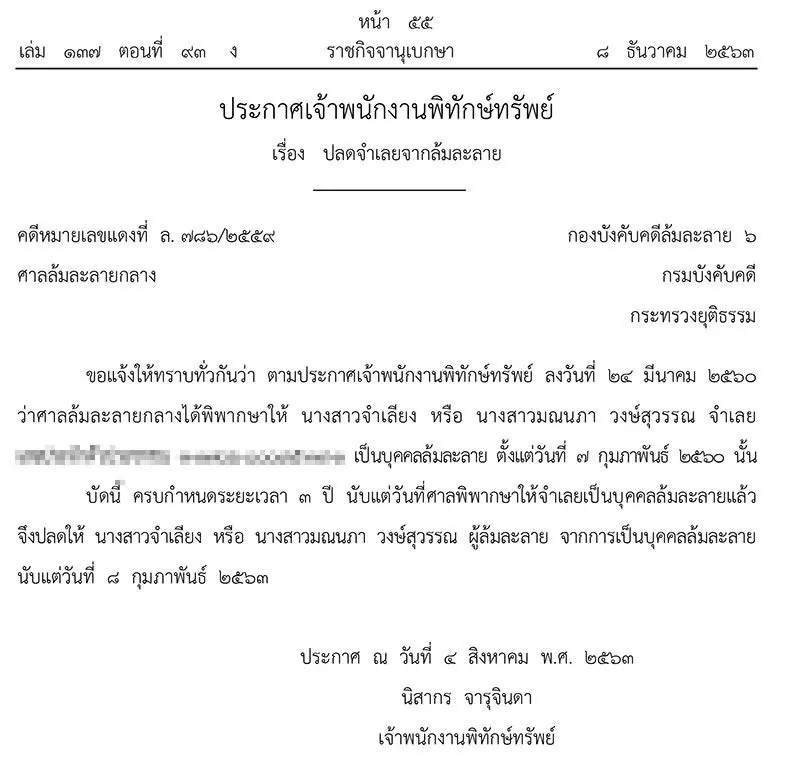 ราชกิจจาฯประกาศ สาวนามสกุล วงษ์สุวรรณ พ้นจากล้มละลาย