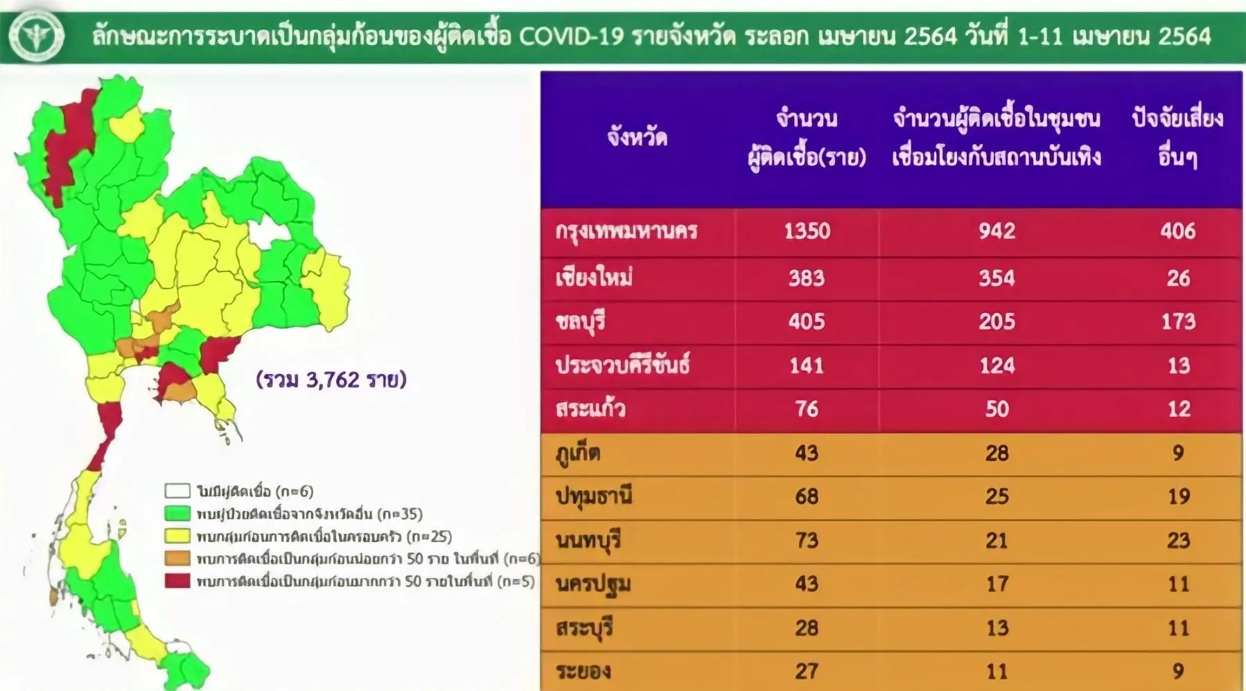 แบ่งพื้นที่ 5 สี โควิด19 —- เมื่อวันที่ 12 เมษายน ที่ กระทรวงสาธารณสุข (สธ.) นพ.โอภาส การย์กวินพงศ์ อธิบดีกรมควบคุมโรค กล่าวว่า การระบาดระลอกใหม่เมษายน 2564 จะแตกต่างจากคราวที่ผ่านมา เนื่องจากผู้ติดเชื้อส่วนใหญ่เป็นผู้ที่ไปเที่ยวสถานบันเทิง คนวัยหนุ่มสาว และนักศึกษา อีกทั้งยังเป็นช่วงปิดเทอมของมหาวิทยาลัยหลายแห่ง และช่วงสงกรานต์ ซึ่งทำให้มีคนกลับบ้านเยอะ