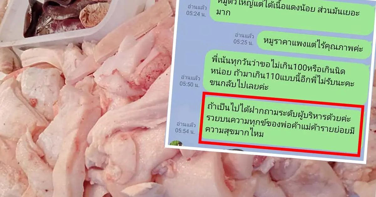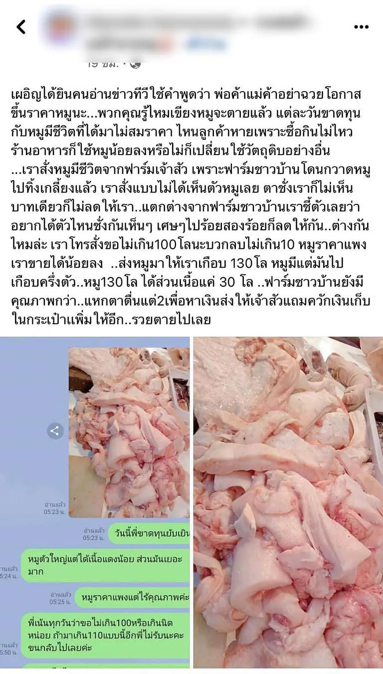 ส่งหมูมาให้เราเกือบ 130โล หมูมีแต่มันไปเกือบครึ่งตัว หมู 130 โล ได้ส่วนเนื้อแค่ 30 โล ..ฟาร์มชาวบ้านยังมีคุณภาพกว่า ทั้งนี้แม่ค้ารายดังกล่าวยังได้มีการไลน์ไปต่อว่าต้นทางที่สั่งหมูมา พร้อมฝากถึงผู้บริหาร รวยบนความทุกข์ของพ่อค้าแม่ค้ามีความสุขมากไหม