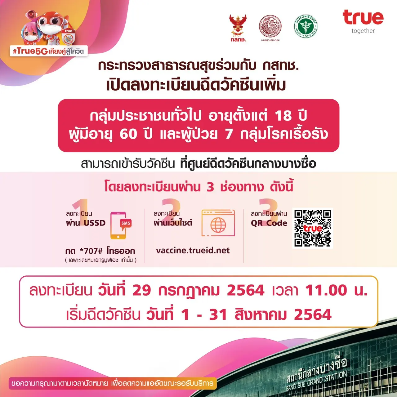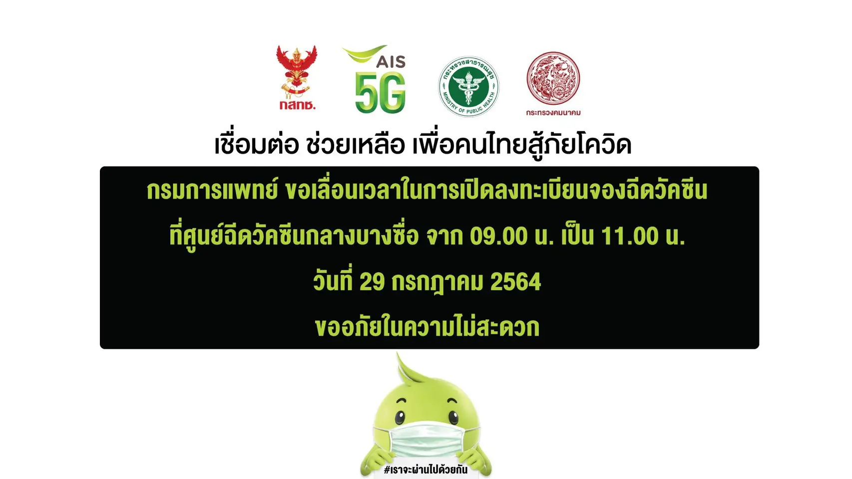 ล่าสุด ผู้ในบริการเครือข่าย AIS / DTAC / TRUE ได้พร้อมใจกันออกมาประกาศว่า “กรมการแพทย์ ขอเลื่อนเวลาในการเปิดลงทะเบียนจองวัคซีน ที่ศูนย์ฉีดวัคซีนกลางบางซื่อ จาก 09.00 น. เป็น 11.00 น. วันที่ 29 กรกฎาคม 2564 ขออภัยในความไม่สะดวก”