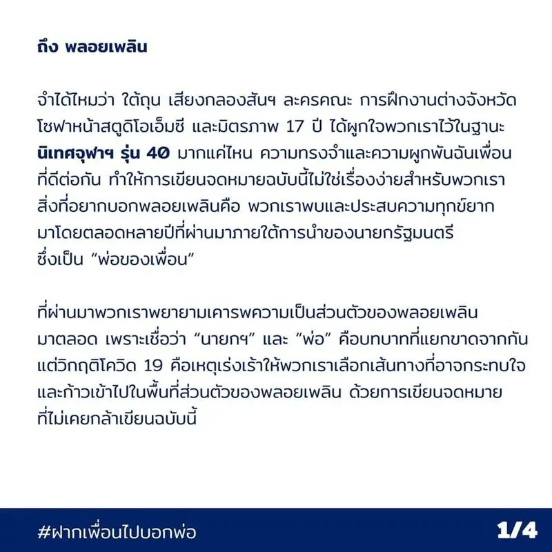 “ก่อนจะเปิดเผยจดหมายนี้สู่สาธารณะ พวกเราได้พยายามติดต่อเพื่อนของเราทุกช่องทาง แต่ไม่สามารถติดต่อได้ จึงตัดสินใจเขียนจดหมายเปิดผนึกฉบับนี้ เพราะหวังว่าข้อความในจดหมายจะไปถึงเพื่อนของเรา