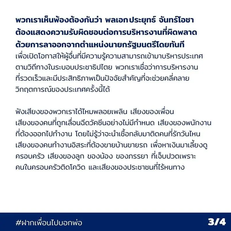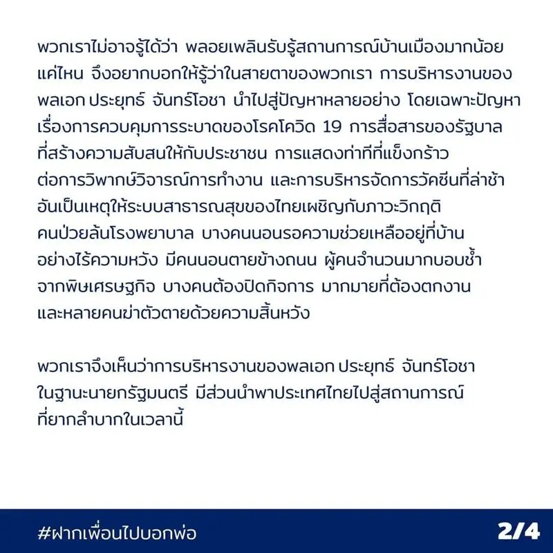 จดหมายถึงลูกประยุทธ์ – เพจ ลูกกอล์ฟ คณาธิป สุนทรรักษ์ ติวเตอร์สอนภาษาอังกฤษชื่อดัง เผยแพร่จดหมายจากเพื่อนนิเทศจุฬาฯ รุ่น 40 ถึงลูกสาว พล.อ.ประยุทธ์ จันทร์โอชา โดยกลุ่มเพื่อนนิเทศจุฬาฯ รุ่น 40 ได้เขียนจดหมายถึง ‘พลอย-เพลิน’ ลูกสาวฝาแฝดของ พล.อ.ประยุทธ์ จันทร์โอชา โดยในจดหมายได้กล่าวถึง ‘พ่อของเพื่อน’ ซึ่งก็คือนายกรัฐมนตรี ใจความสำคัญนั้นเป็นการกล่าวถึงปัญหาและความเดือดร้อนของประชาชนที่เกิดขึ้นขณะ พล.อ.ประยุทธ์ จันทร์โอชา ดำรงตำแหน่งนายกรัฐมันตรี ซึ่งในจดหมายนั้นเป็นการหวังว่าเสียงของลูกสาวทั้ง 2 จะสำคัญพอให้พ่อฟัง โดยมีการยกตัวอย่างสถานการณ์ให้เห็นอย่างชัดเจนว่าตอนนี้ ประชาชนที่ต้องเผชิญกับการเจ็บป่วยจากการติดเชื้อโควิด จนผู้ป่วยที่ล้นโรงพยาบาล ไม่มีเตียง และยังมีผู้เสียชีวิต ทั้งยังได้พูดถึงเศรษฐกิจ จนบางคนถึงขั้นปิดกิจการ และฆ่าตัวตาย จึงขอวอนไปบอกพ่อให้ลาออกแล้วให้คนมีความสามารถมาทำแทน