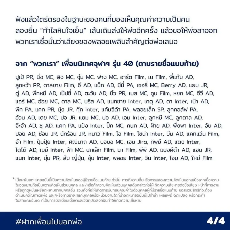 “จดหมายจากเพื่อนนิเทศจุฬาฯ รุ่น 40 (ตามรายชื่อแนบท้าย) ถึงเพื่อนของเรา จดหมายฉบับนี้ เป็นจดหมายที่เพื่อนๆ เขียนร่วมกัน ทุกขั้นตอนได้รับฉันทามติจากการประชุมของเพื่อนๆ ตามรายชื่อแนบท้าย แม้ว่าจดหมายฉบับนี้จะเผยแพร่ทางเพจ LG and Friends แต่ลูกกอล์ฟเป็นเพียงเสียงหนึ่งในที่ประชุมเท่านั้น และเสียงของลูกกอล์ฟเท่ากับเสียงของเพื่อน ๆ ทุกคนในจดหมายนี้