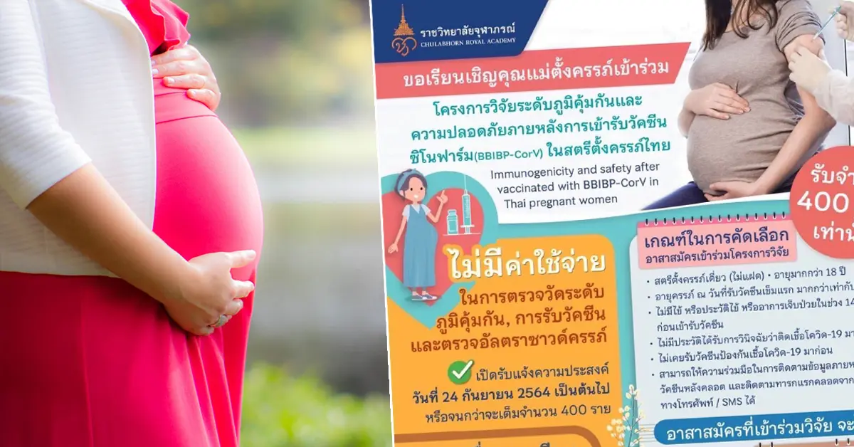 โรงพยาบาลจุฬาภรณ์ เชิญชวน หญิงตั้งครรภ์ เข้ารับวัคซีน ‘ซิโนฟาร์ม‘ ฟรี 2 เข็ม เพื่อวิจัยระดับภูมิคุ้มกัน รับจำกัดเพียง 400 คนเท่านั้น