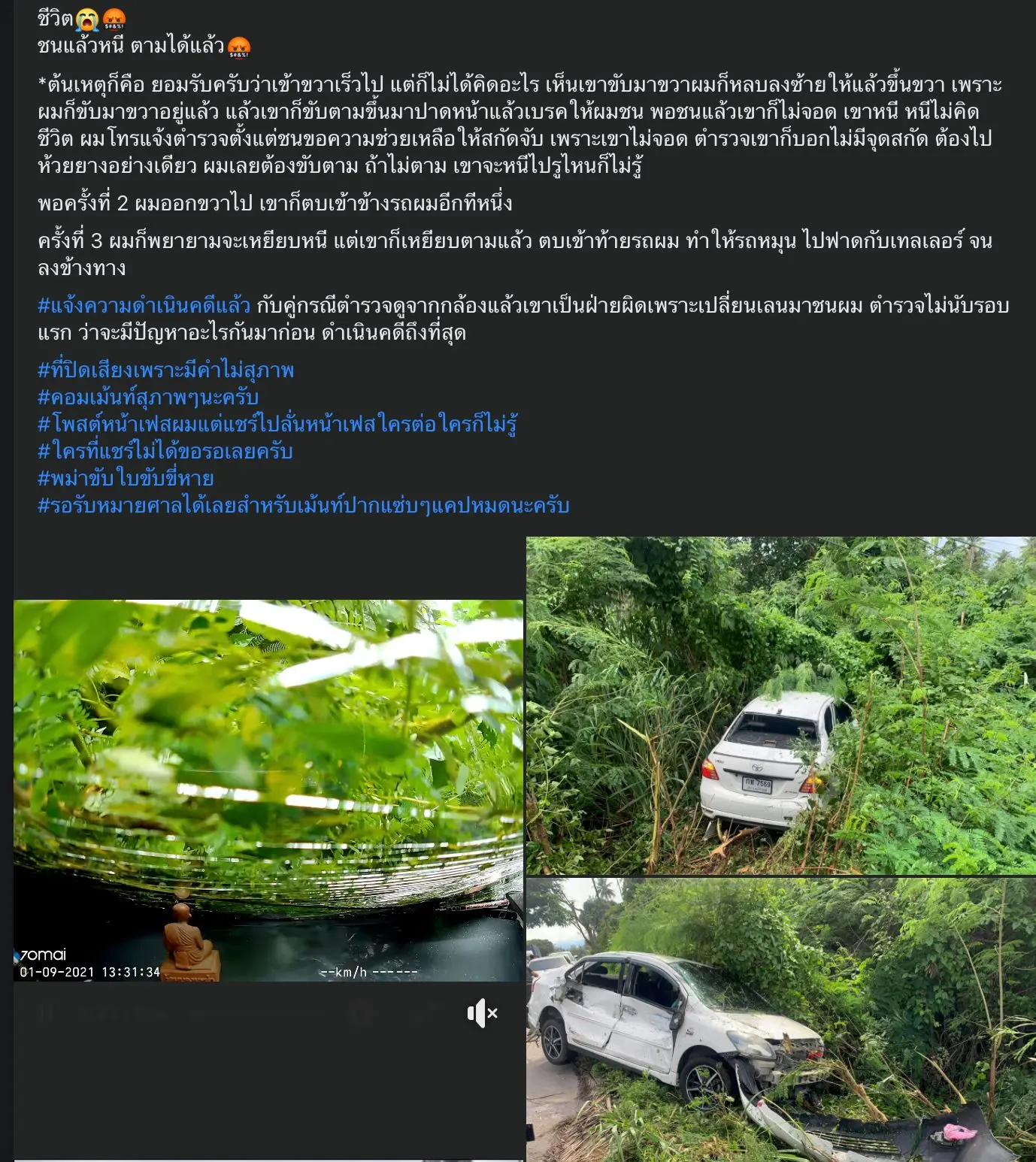 เหตุการณ์ระทึกขวัญจากกล้องหน้าที่รถผู้ใช้เฟซบุ๊ครายหนึ่งในมาโพสต์กรณีถูกรถคู่กรณีชน เหตุไม่พอใจจึงพยายามหาเรื่องด้วยการขับปาดหน้าให้ชนท้าย ผู้เสียหายเกรงว่าอีกฝ่ายจะขับหนีจึงขับรถไล่ตาม ซึ่งก็ได้โทรแจ้งให้ตำรวจช่วยเหลือสกัดจับแล้วแต่ โชคไม่ดีที่ละแวกนั้นไม่มีด่านเลย ทำให้เกิดการขับไล่ล่ากันเกิดขึ้น โดยคู่กรณีได้มีการขับรถไล่ชนผู้เสียหายอยู่หลายครั้ง จนท้ายที่สุดผู้เสียหายถูกชนท้ายด้านข้าง ประจวบเหมาะกับมาด้วยความเร็วและฝนตกทำให้ถนนลื่น เป็นเหตุให้รถหมุนและพุ่งตกข้างทาง โดยผู้เสียหายได้โพสต์เหตุการณ์ไว้ระบุว่า