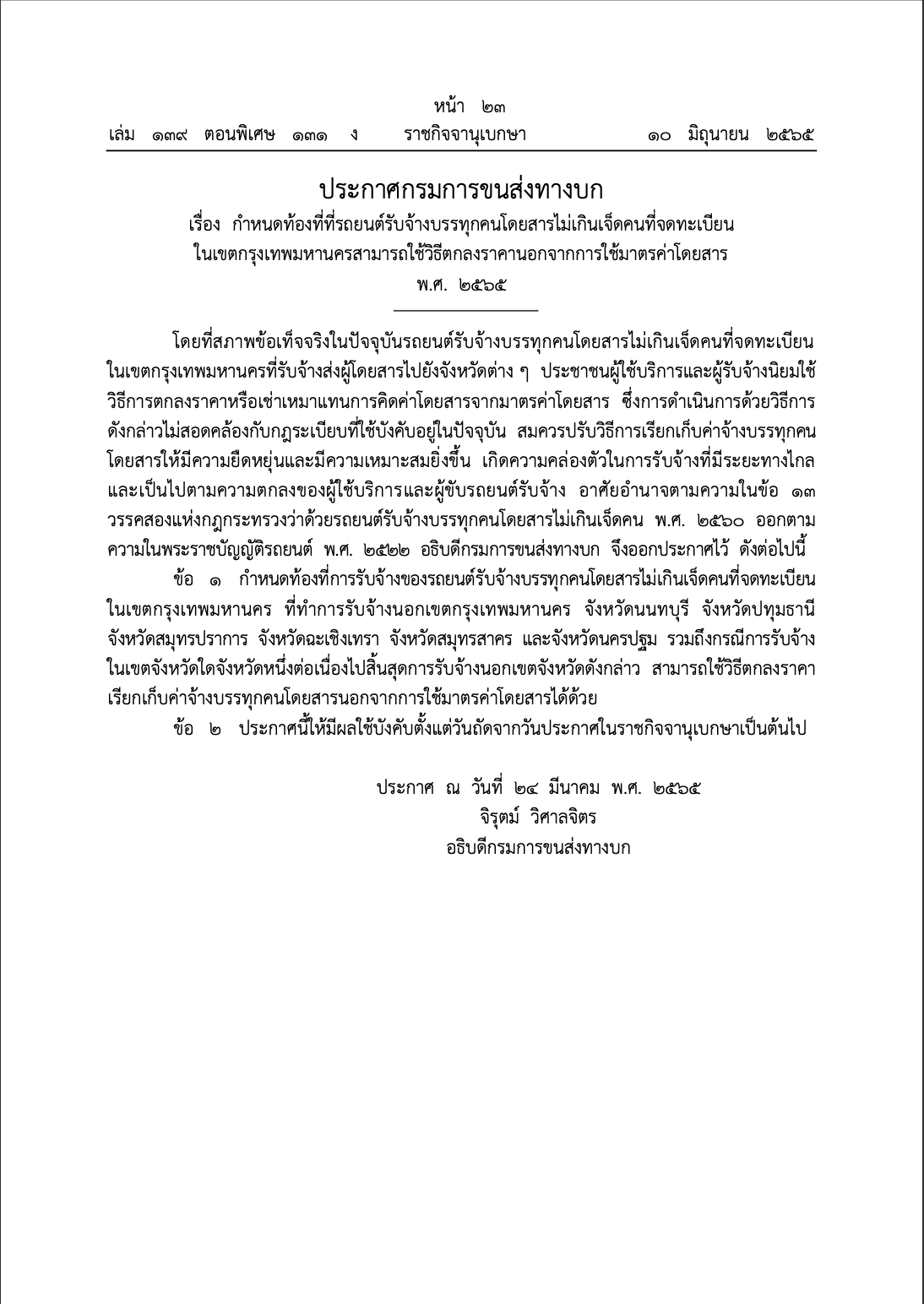 เว็บไซต์ราชกิจจานุเบกษา เผยแพร่ประกาศกรมการขนส่งทางบก เรื่อง กำหนดท้องที่ที่รถยนต์รับจ้างบรรทุกคนโดยสารไม่เกินเจ็ดคน ที่จดทะเบียนในเขตกรุงเทพมหานคร สามารถใช้วิธีตกลงราคานอกจากการใช้มาตรค่าโดยสาร พ.ศ. 2565