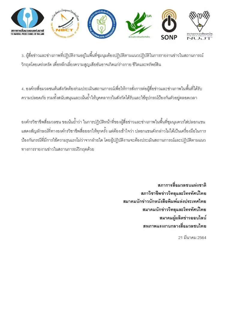 ล่าสุดวันนี้ 21 มี.ค.องค์กรวิชาชีพสื่อมวลชน ได้ออกแถลงการณ์ ระบุข้อความว่า…แถลงการณ์ร่วมองค์กรวิชาชีพสื่อมวลชน เรื่อง การปะทะระหว่างเจ้าหน้าที่และกลุ่มผู้ชุมนุม จนทุกฝ่ายได้รับบาดเจ็บทั้งเจ้าหน้าที่ ผู้ชุมนุม และสื่อมวลชนที่รายงานข่าว
