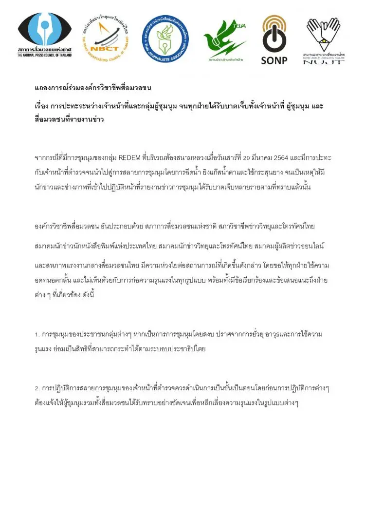 จากกรณีที่มีการชุมนุมของกลุ่ม REDEM ที่บริเวณท้องสนามหลวงเมื่อวันเสาร์ที่ 20 มีนาคม 2564 และมีการปะทะกับเจ้าหน้าที่ตำรวจจนนำไปสู่การสลายการชุมนุมโดยการฉีดน้ำ ยิงแก๊สน้ำตาและใช้กระสุนยาง จนเป็นเหตุให้มีนักข่าวและช่างภาพที่เข้าไปปฏิบัติหน้าที่รายงานข่าวการชุมนุมได้รับบาดเจ็บหลายรายตามที่ทราบแล้วนั้น