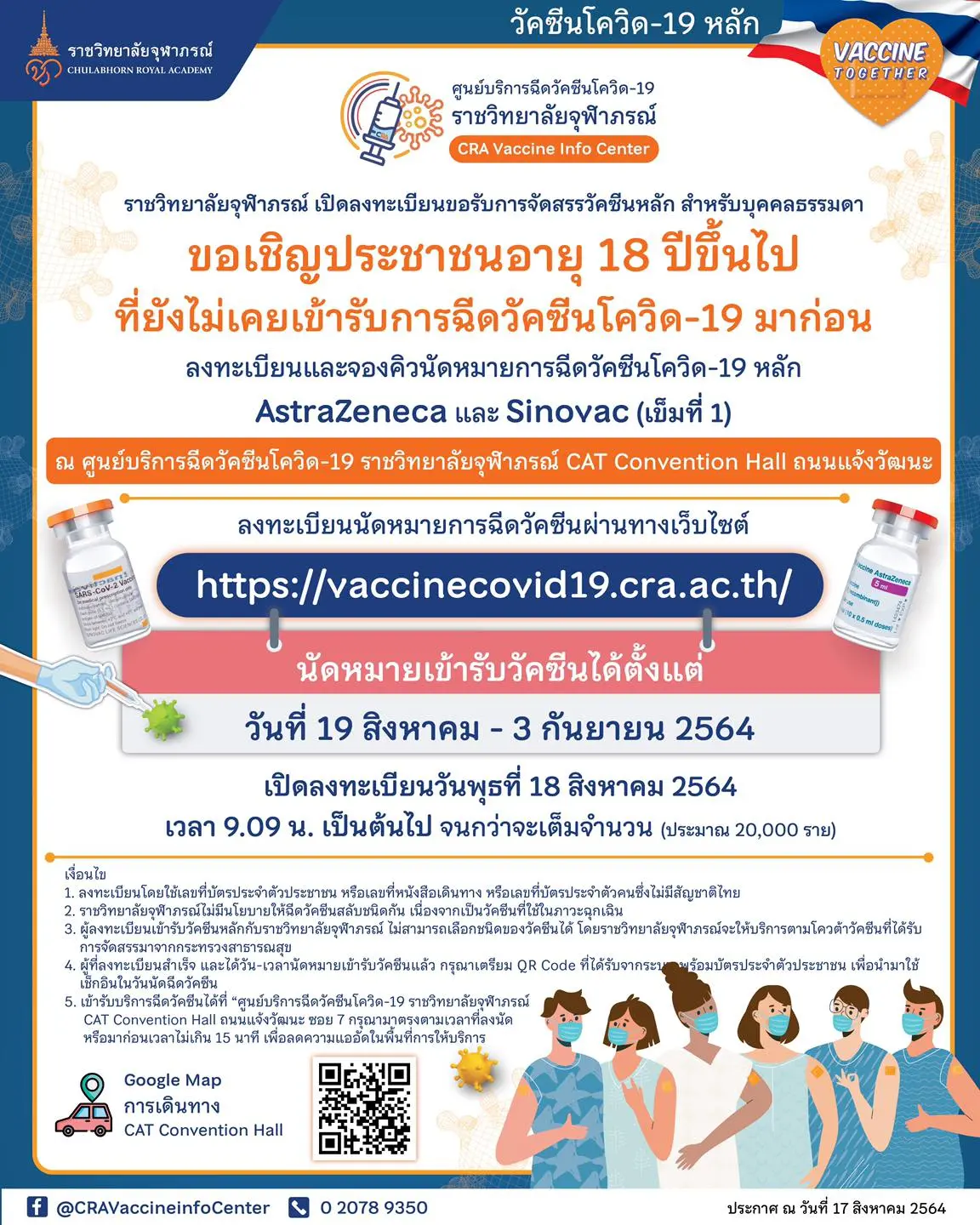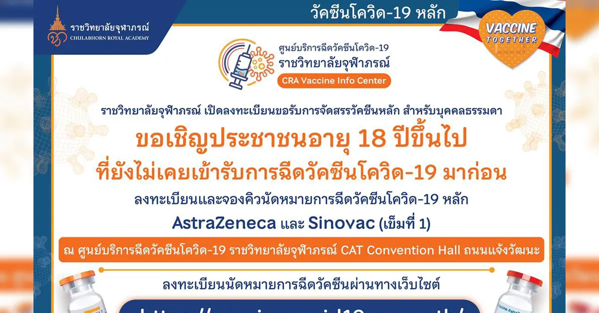 ราชวิทยาลัยจุฬาภรณ์ เปิดลงทะเบียนขอรับการจัดสรรวัคซีนหลัก สำหรับบุคคลธรรมดา อายุ 18 ปีขึ้นไป ที่ยังไม่เคยเข้ารับการฉีดวัคซีนโควิด-19 มาก่อน ลงทะเบียนและจองคิวนัดหมายการฉีดวัคซีนโควิด-19 หลัก AstraZeneca และ Sinovac (เข็มที่ 1) ณ ศูนย์บริการฉีดวัคซีนโควิด-19 ราชวิทยาลัยจุฬาภรณ์ CAT Convention Hall ถนนแจ้งวัฒนะ