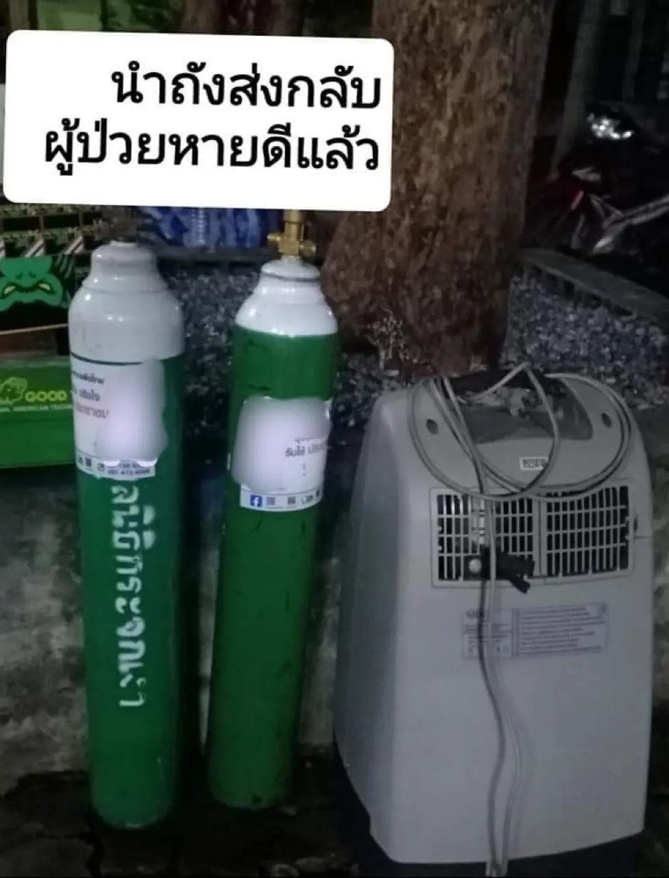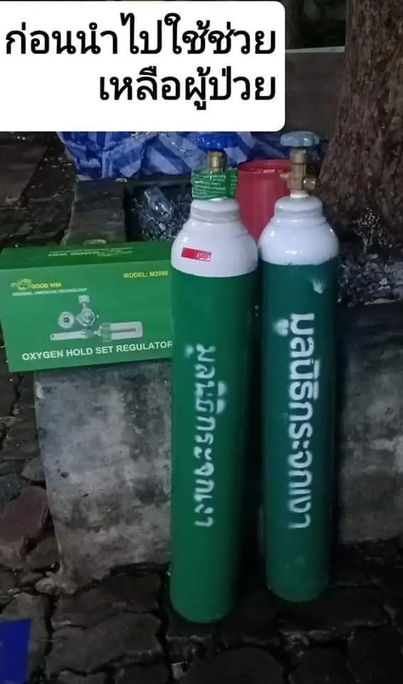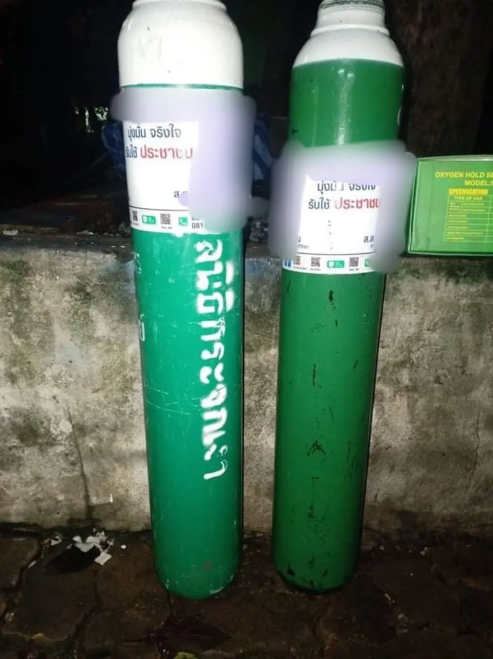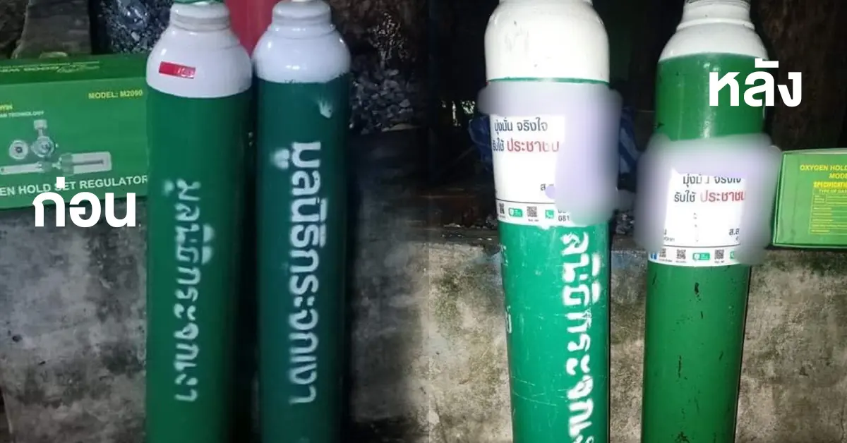 กู้ภัยงงหนัก หลังส่ง ถังออกซิเจนช่วยโควิด19 ขาไปสะอาดเอี่ยม ขารับกลับ เจอสติกเกอร์พรรคการเมืองหนึ่งติดทับแทน? ลั่นไม่คิดลงทุนหน่อยหรอ