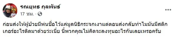 ‘ก่อนส่งให้ผู้ป่วยมีพ่นชื่อไว้แค่มูลนิธิกระจกเงาแต่ตอนส่งกลับทำไมมันมีสติกเกอร์อะไรติดมาด้วยว่ะเนี่ย นี้พวกคุณไม่คิดจะลงทุนอะไรกันเลยเหรอครับ’