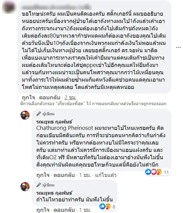 ทั้งนี้เจ้าของโพสต์ก็ได้มาตอบกลับข้อความดังกล่าว โดยระบุว่า “คิดก่อนเขียนมีสตินะครับ การที่จะช่วยคนหากคิดว่าเกินกำลังไม่ควรทำครับ หรือหากต้องหางบไม่มีใครจะว่าคุณเลยครับ แต่มาทำแล้วไม่ควรมีการเมืองมาแอบแฝงครับ และที่เติมO2 ฟรี มีหลายที่ครับไม่ต้องเอามาอ้างมันฟังไม่ขึ้น สิ่งคุณทำมันผิดแค่คุณขอโทษก็จบแต่นี้คือยังไม่สำนึก”
