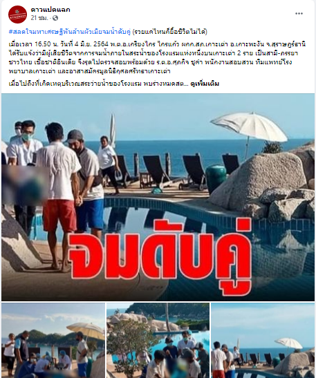 ทั้งสองเป็นคนสัญชาติไทย เชื้อชาติอินเดีย และเป็นเจ้าของธุรกิจพันล้าน มีโรงแรมห้าดาวที่จ.ภูเก็ต และเป็นเจ้าของโรงงานฉีดพลาสติกที่จ.ระยอง และปราจีนบุรีจากการสอบปากคำลูกชายของผู้เสียชีวิต ให้การว่า ตนเองและพ่อกับแม่ได้เดินทางมาเที่ยวเกาะเต่าเพื่อพักผ่อน ก่อนเกิดเหตุตนเองได้แยกไปเดินเล่นบริเวณชายหาด ส่วนพ่อและแม่ได้เล่นน้ำที่สระว่ายน้ำของโรงแรม เมื่อตนเองเดินกลับมาก็พบว่าพ่อกับแม่จมน้ำอยู่ในสระว่ายน้ำ ตนเองจึงรีบวิ่งไปแจ้งพนักงานโรงแรมให้มาช่วยเหลือ ต่อมาก็มีทีมแพทย์โรงพยาบาลเกาะเต่า และกู้ภัยมูลนิธิกุศลศรัทธาเกาะเต่า เข้ามาช่วยชีวิตพ่อกับแม่ แต่ไม่สามารถยื้อชีวิตทั้งสองไว้ได้จากการตรวจสอบที่เกิดเหตุไม่พบร่องรอยการต่อสู้
