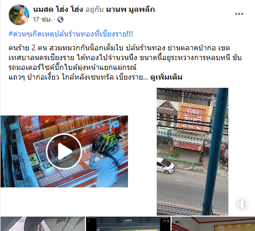 ผู้ใช้เฟสบุ๊ค นมสด โฮ่ง โฮ่ง ได้โพสต์ภาพและคลิป เหตุการณ์ คนร้าย 2 คนร้ายบุกปล้นห้างทองเชียงราย กวาดทองคำ 114 บาท มูลค่ากว่า 3 ล้าน ขับรถมอเตอร์ไซค์บิ๊กไบค์หลบหนีมุ่งหน้าแยกแม่กรณ์แถวๆ ป่าก่อเงี้ยว ใกล้หลังเซนทรัล เชียงราย