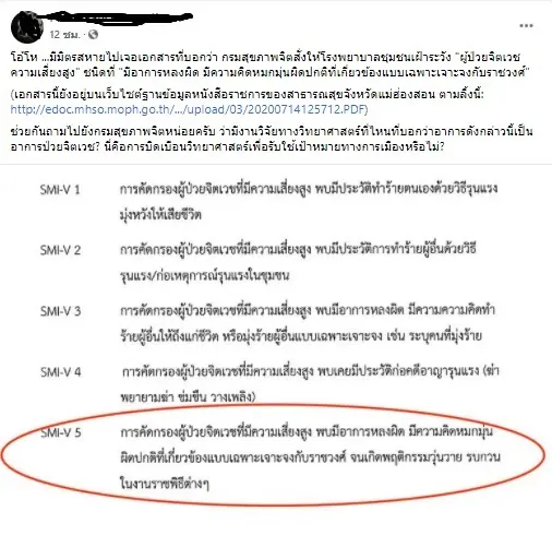 โอ้โห …มีมิตรสหายไปเจอเอกสารที่บอกว่า กรมสุขภาพจิตสั่งให้โรงพยาบาลชุมชนเฝ้าระวัง “ผู้ป่วยจิตเวชความเสี่ยงสูง” ชนิดที่ “มีอาการหลงผิด มีความคิดหมกมุ่นผิดปกติที่เกี่ยวข้องแบบเฉพาะเจาะจงกับราชวงศ์”(เอกสารนี้ยังอยู่บนเว็บไซต์ฐานข้อมูลหนังสือราชการของสาธารณสุขจังหวัดแม่ฮ่องสอน ตามลิ้งนี้: http://edoc.mhso.moph.go.th/…/upload/03/20200714125712.PDF)ช่วยกันถามไปยังกรมสุขภาพจิตหน่อยครับ ว่ามีงานวิจัยทางวิทยาศาสตร์ที่ไหนที่บอกว่าอาการดังกล่าวนี้เป็นอาการป่วยจิตเวช? นี่คือการบิดเบือนวิทยาศาสตร์เพื่อรับใช้เป้าหมายทางการเมืองหรือไม่?