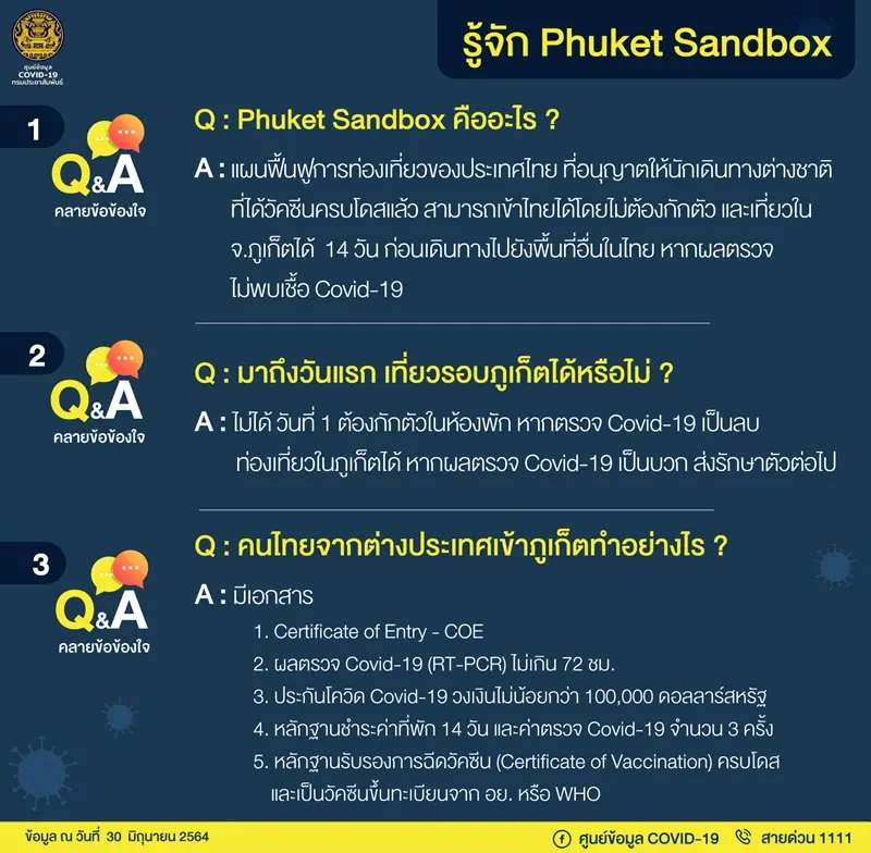 แผนฟื้นฟูการท่องเที่ยวของประเทศไทย ที่รัฐบาลต้องการกำหนดให้จังหวัดภูเก็ตเป็นพื้นที่ทดสอบการท่องเที่ยวและการเปิดประเทศ ที่จะรับชาวต่างชาติที่ได้วัคซีนครบโดสแล้ว สามารถเข้าไทยได้โดยไม่ต้องกักตัว และเที่ยวใน จ.ภูเก็ต ได้ 14 วัน ก่อนเดินทางไปยังพื้นที่อื่นในไทย และผู้ที่เข้ามาเที่ยวได้รับการฉีดวัคซีนครบแล้ว เพื่อทดสอบว่ากฎระเบียบต่าง ๆ ที่กำหนดขึ้นนั้นเอื้อต่อการท่องเที่ยวหรือไม่ จะดึงดูดนักท่องเที่ยวให้กลับมาได้หรือไม่ และจะทำให้เกิดการติดเชื้อหรือแพร่ระบาดของโรคในชุมชนได้หรือไม่ โดยนักท่องเที่ยวที่เข้ามานั้นหากผลตรวจไม่ติดโควิดก็จะท่องเที่ยวในภูเก็ตได้มีขอบเขตการทดสอบแค่ในจังหวัดภูเก็ตเท่านั้น ดังนั้นนักท่องเที่ยวจะออกจากภูเก็ตไม่ได้ แต่หากพบว่านักท่องเที่ยวคนใดติดโควิดก็จะว่งทำการรักษาไปตามขั้นตอน