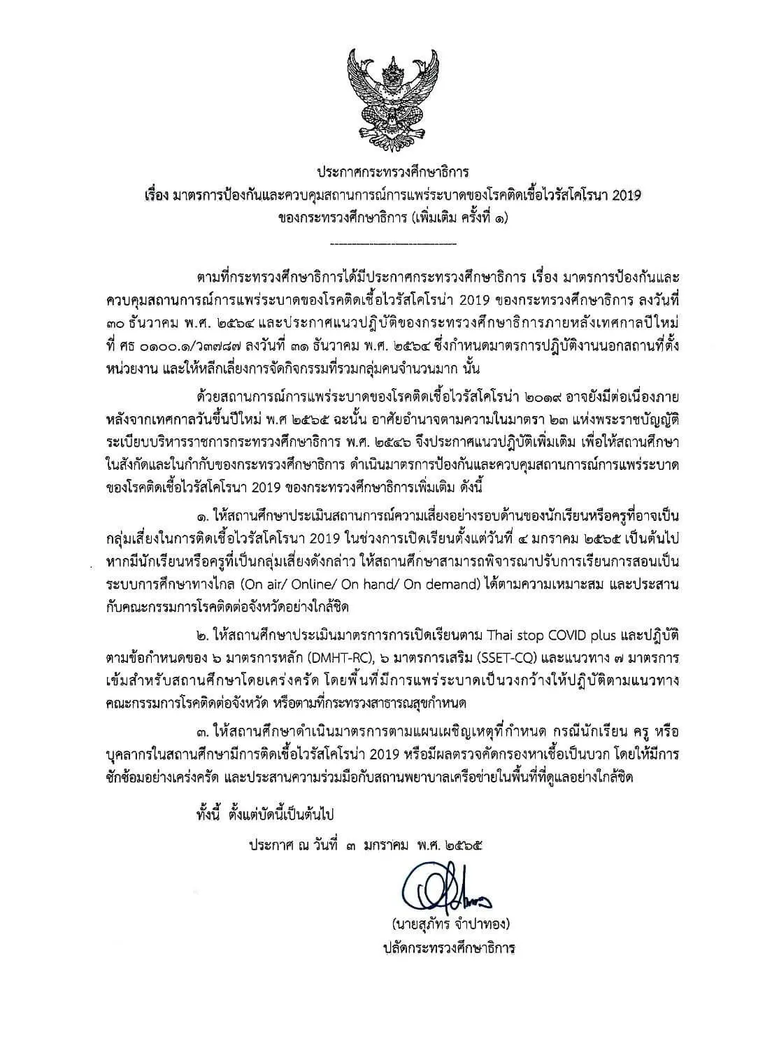 เมื่อวันที่ 3 มกราคม 2565 ทางด้านของกระทรวงศึกษาธิการ ได้ออกประกาศหนึ่งฉบับ มาตรการป้องกันและควบคุมสถานการณ์การแพร่ระบาดของโรคติดเชื้อไวรัสโคโรนา 2019 โดยระบุว่า