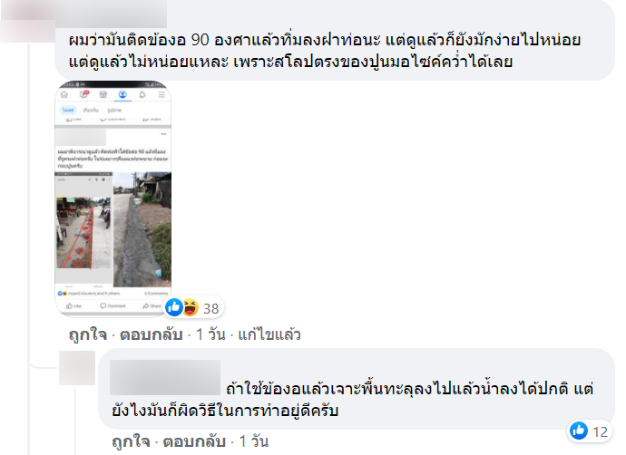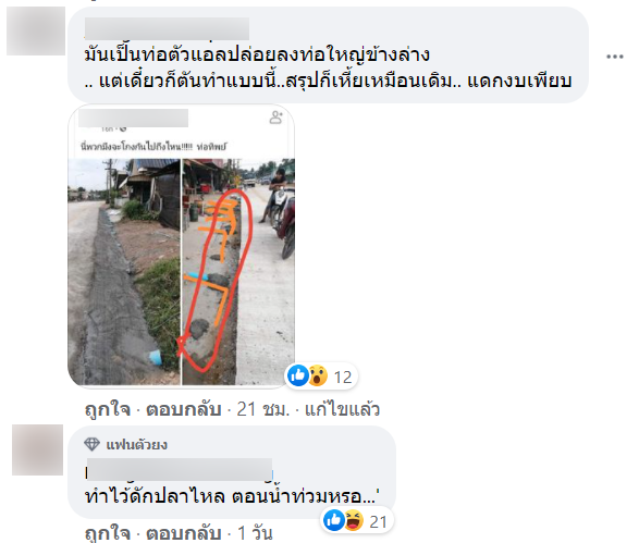 หลังจากที่การแชร์ภาพออกไป จนมีคนแชร์กันอย่างล้นหลาม ทั้งยังมีมีชาวเน็ตเข้ามาคอมเมนต์เป็นจำนวนมาก บางรายบอกว่า เป็นความทุเรศของหน่วยงานที่เกี่ยวข้อง แทนที่จะทำให้เรียบร้อยและใช้งานยาว ๆ เป็นงี้เดี๋ยววันข้างหน้าก็เบิกงบมาทำอีก บางรายบอกว่า เป็นการทำที่ถูกต้องแล้ว เพราะท่อระบายน้ำอยู่ด้านล่าง แต่ถนนยกสูง บางรายบอกว่าเป็นท่อระบายน้ำทิพย์