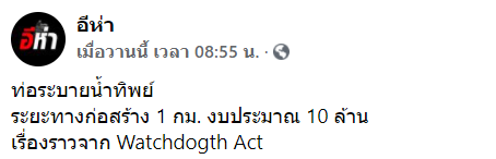 โดยเมื่อวันที่ 7 มิถุนายนที่ผ่านมา ได้มีเพจเฟซบุ๊ก อีห่า โพสต์ภาพ เผยให้เห็นภาพท่อ ที่ดูเหมือนว่าจะเป็นท่อระบายน้ำในอนาคต และกำลังก่อสร้าง แต่ไม่เสร็จดี พร้อมระบุข้อความว่า “ท่อระบายน้ำทิพย์ ระยะทางก่อสร้าง 1 กิโลเมตร งบประมาณ 10 ล้าน“