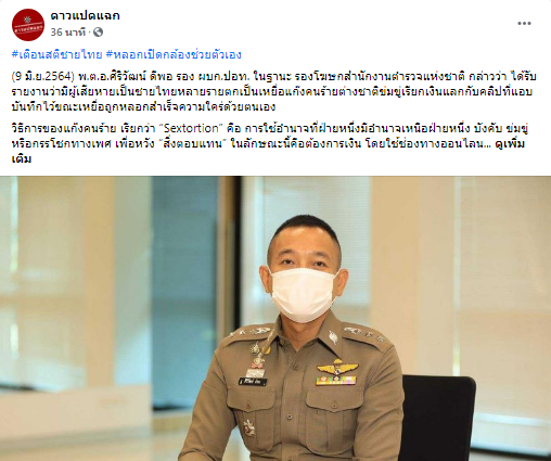 ลวงให้เปิดกล้องช่วยตัวเอง ขู่เรียกเงิน – 9 มิ.ย.2564) พ.ต.อ.ศิริวัฒน์ ดีพอ รอง ผบก.ปอท. ในฐานะ รองโฆษกสำนักงานตำรวจแห่งชาติ กล่าวว่า ได้รับรายงานว่ามีผู้เสียหายเป็นชายไทยหลายรายตกเป็นเหยื่อแก๊งคนร้ายต่างชาติข่มขู่เรียกเงินแลกกับคลิปที่แอบบันทึกไว้ขณะเหยื่อถูกหลอกสำเร็จความใคร่ด้วยตนเองวิธีการของแก๊งคนร้าย เรียกว่า “Sextortion” คือ การใช้อำนาจที่ฝ่ายหนึ่งมีอำนาจเหนือฝ่ายหนึ่ง บังคับ ข่มขู่หรือกรรโชกทางเพศ เพื่อหวัง “สิ่งตอบแทน” ในลักษณะนี้คือต้องการเงิน โดยใช้ช่องทางออนไลน์ในการกระทำผิด ซึ่งจะเริ่มต้นด้วยการใช้ภาพโปรไฟล์หญิงสาวสวยเซ็กซี่ชาวต่างชาติทั้งฝรั่ง หรือ หญิงสาวประเทศในแถบเอเซียแอดมาขอเป็นเพื่อนผ่านโซเชียลมีเดียต่างๆ ทั้ง ไลน์และเฟซบุ๊ก