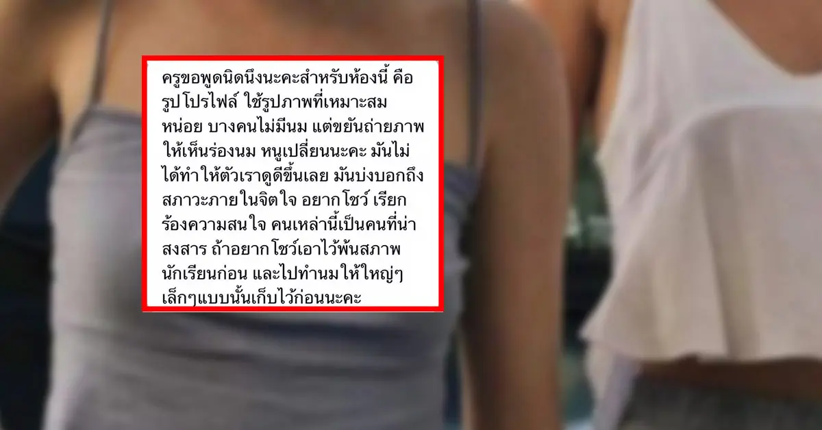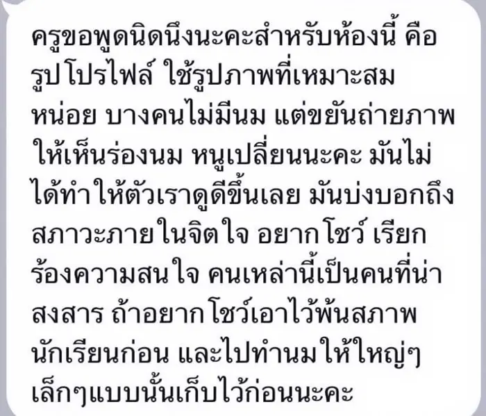 “ครูขอพูดนิดนึงนะคะสำหรับห้องนี้ คือรูปโปรไฟล์ใช้รูปภาพที่เหมาะสมหน่อย บางคนไม่มีนม แต่ขยันถ่ายภาพให้เห็นร่องนม หนูเปลี่ยนนะคะ มันไม่ได้ทำให้ตัวเราดูดีขึ้นเลย มันบ่งบอกถึงสภาวะภายในจิตใจ อยากโชว์ เรียกร้องความสนใจ คนเหล่านี้เป็นคนที่น่าสงสาร ถ้าอยากโชว์เอาไว้พ้นสภาพนักเรียนก่อน และไปทำนมให้ใหญ่ ๆ เล็ก ๆ แบบนั้นเก็บไว้ก่อนนะคะ”
