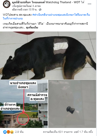 นายอำเภอยิงหมา ขวัญใจตำรวจ สภ.ชุมแสง 20 มิถุนายน 2564 เพจเฟซบุ๊ก มูลนิธิวอชด็อก ไทยแลนด์ Watchdog Thailand – WDT โพสต์ข้อความระบุว่า เมื่อประมาณ 3-4 วัน ที่ผ่านมา นายอำเภอชุมแสง ยิงสุนัข ชื่อว่าลีโอ เนื่องจากนายอำเภอรายนี้ คิดว่าลีโอไปกัดพรม จึงบันดาลโทสะควักปืนยิงจนได้รับบาดเจ็บ ต่อมาเจ้าหน้าที่ตำรวจสภ.ชุมแสง ได้เรี่ยไรออกค่าใช้จ่ายในการรักษาลีโอ จนอาการปลอดภัย