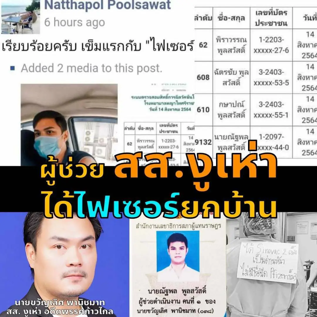 โดยภาพที่เพจโพสต์ภาพนายณัฐพล ผู้ช่วย ส.ส.ชลบุรี นายขวัญเลิศ พานิชมาก อดีตเคยสังกัดพรรคก้าวไกล พร้อมข้อความว่า “เรียบร้อยครับ เข็มแรกกับ “ไฟเซอร์” อีกภาพเป็นรายชื่อจากระบบตรวจสอบสิทธิ์การฉีดวัคซีนชองโรงพยาบาลแห่งหนึ่ง ในพื้นที่อำเภอศรีราชา จังหวัดชลบุรี โดยมีรายชื่อของคนในครอบครัวนายณัฐพล ซึ่งใช้นามสกุลเดียวกันอีก 3 คน ได้ฉีดวัคซีนเมื่อวันเสาร์ที่ 14 สิงหาคมที่ผ่านมา ซึ่งเป็นช่วงเวลาที่จังหวัดชลบุรีระดมฉีดวัคซีนไฟเซอร์