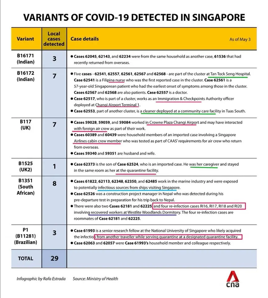 เพจเฟซบุ๊คอย่าง แพทย์ไทย ไอเดียสุด / Doc Idea D ได้แชร์เรื่องราวของประเทศเพื่อนบ้านอย่าง ประเทศสิงคโปร์ ที่เจอเชื้อโควิดกลายพันธุ์กว่า 6 ตัว และตรวจเจอผู้ติดเชื้อกว่า 60 รายในชุมชน และเปิดเผยรายละเอียดของผู้ติดเชื้อแล้วกว่า 30 ราย