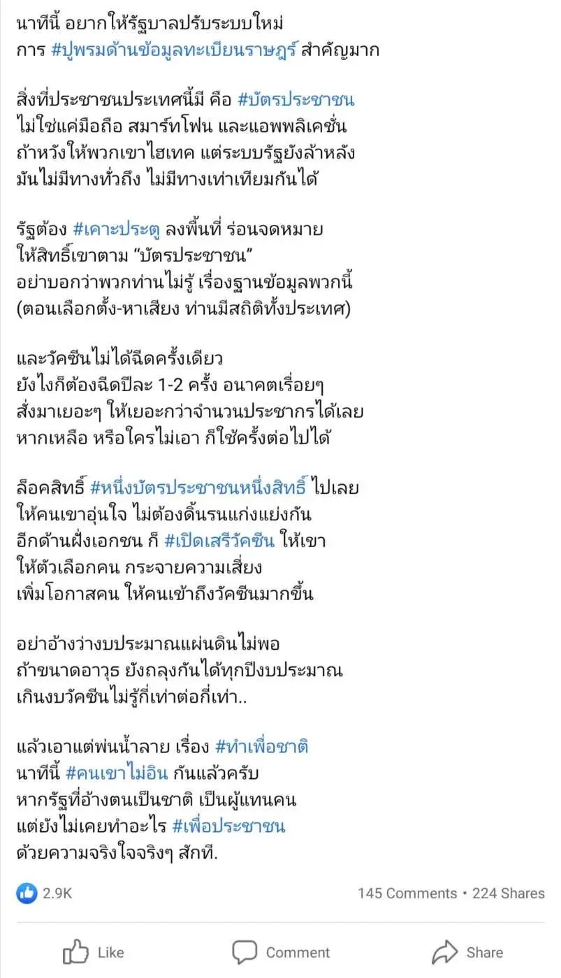 นาทีนี้ อยากให้รัฐบาลปรับระบบใหม่การ #ปูพรมด้านข้อมูลทะเบียนราษฎร์ สำคัญมากสิ่งที่ประชาชนประเทศนี้มี คือ #บัตรประชาชนไม่ใช่แค่มือถือ สมาร์ทโฟน และแอพพลิเคชั่นถ้าหวังให้พวกเขาไฮเทค แต่ระบบรัฐยังล้าหลังมันไม่มีทางทั่วถึง ไม่มีทางเท่าเทียมกันได้รัฐต้อง #เคาะประตู ลงพื้นที่ ร่อนจดหมายให้สิทธิ์เขาตาม “บัตรประชาชน”อย่าบอกว่าพวกท่านไม่รู้ เรื่องฐานข้อมูลพวกนี้(ตอนเลือกตั้ง-หาเสียง ท่านมีสถิติทั้งประเทศ)และวัคซีนไม่ได้ฉีดครั้งเดียว ยังไงก็ต้องฉีดปีละ 1-2 ครั้ง อนาคตเรื่อยๆสั่งมาเยอะๆ ให้เยอะกว่าจำนวนประชากรได้เลยหากเหลือ หรือใครไม่เอา