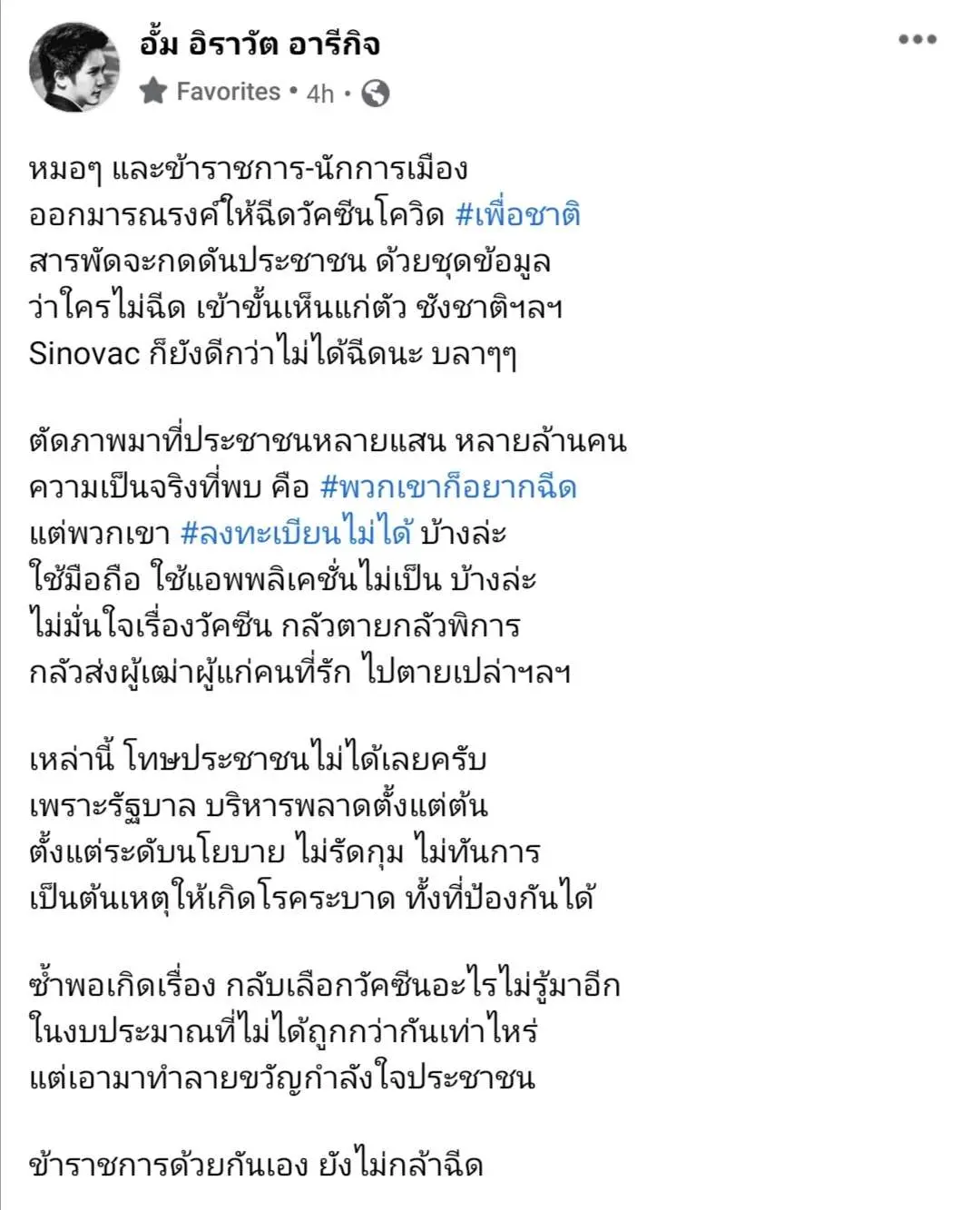 หมอๆ และข้าราชการ-นักการเมืองออกมารณรงค์ให้ฉีดวัคซีนโควิด #เพื่อชาติสารพัดจะกดดันประชาชน ด้วยชุดข้อมูลว่าใครไม่ฉีด เข้าขั้นเห็นแก่ตัว ชังชาติฯลฯSinovac ก็ยังดีกว่าไม่ได้ฉีดนะ บลาๆๆตัดภาพมาที่ประชาชนหลายแสน หลายล้านคนความเป็นจริงที่พบ คือ #พวกเขาก็อยากฉีด แต่พวกเขา #ลงทะเบียนไม่ได้ บ้างล่ะใช้มือถือ ใช้แอพพลิเคชั่นไม่เป็น บ้างล่ะไม่มั่นใจเรื่องวัคซีน กลัวตายกลัวพิการกลัวส่งผู้เฒ่าผู้แก่คนที่รัก ไปตายเปล่าฯลฯเหล่านี้ โทษประชาชนไม่ได้เลยครับเพราะรัฐบาล บริหารพลาดตั้งแต่ต้นตั้งแต่ระดับนโยบาย ไม่รัดกุม ไม่ทันการเป็นต้นเหตุให้เกิดโรคระบาด ทั้งที่ป้องกันได้ซ้ำพอเกิดเรื่อง กลับเลือกวัคซีนอะไรไม่รู้มาอีกในงบประมาณที่ไม่ได้ถูกกว่ากันเท่าไหร่แต่เอามาทำลายขวัญกำลังใจประชาชนข้าราชการด้วยกันเอง ยังไม่กล้าฉีด