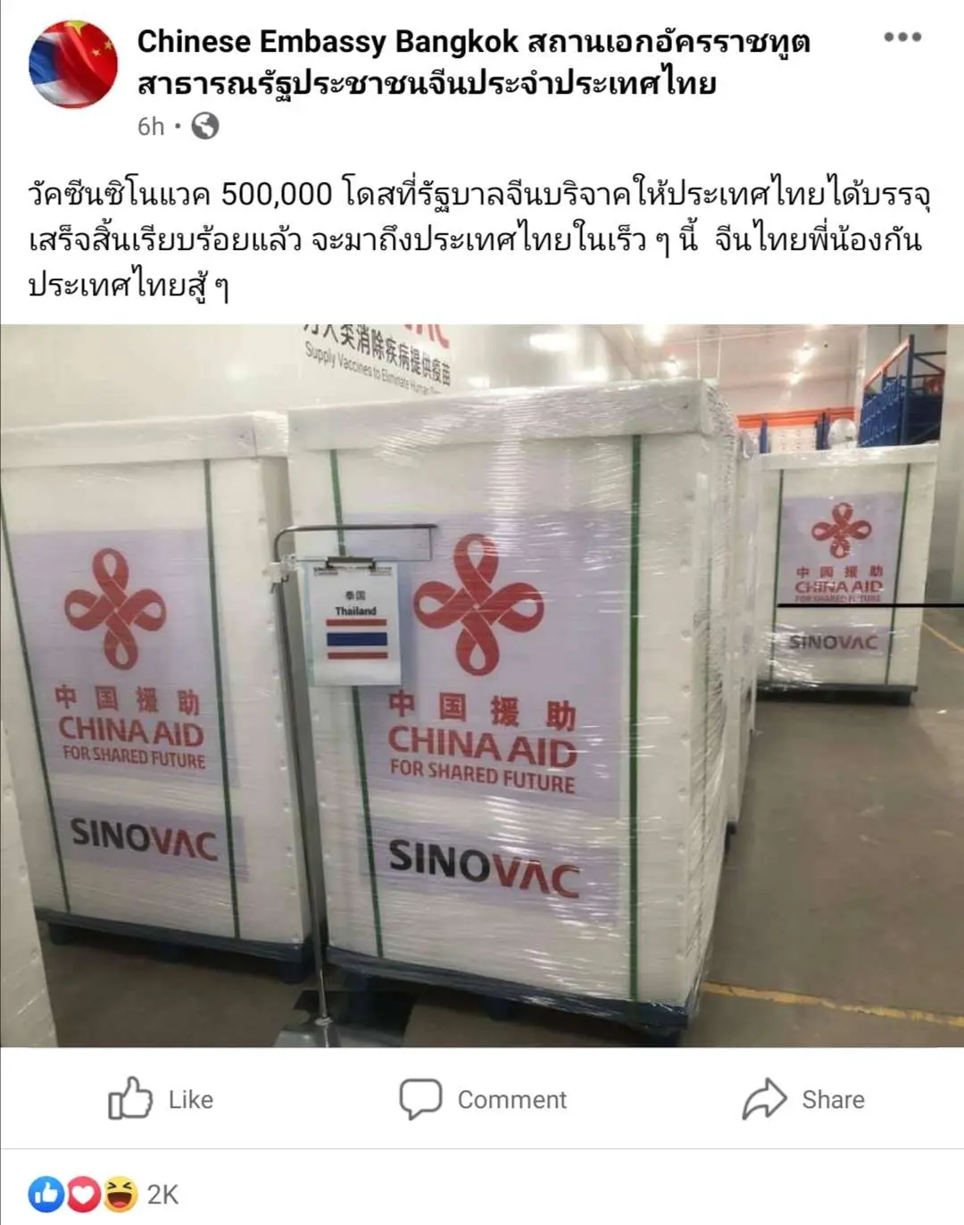 ท่ามกลางความสงสัยและกังกลของประชาชนที่มีต่อวัคซีน Sinovac ที่มากไปด้วยผลข้างเคียง โดยล่าสุดทาง Chinese Embassy Bangkok สถานเอกอัครราชทูตสาธารณรัฐประชาชนจีนประจำประเทศไทย ได้ะบุว่าทาง จีนแจกวัคซีน Sinovac จำนวน 500,000 โดส ซึ่งทำให้ประชาชนอดคิดไม่ได้ว่าที่เอามาแจกมันเป็นของดีจริงหรือไม่ ดีจริงทำไมเอามาแจก เพราะเดิมที่กระแสแง่าลบของวัคซีน Sinovac ก็มากอยู่พอสมควร ซึ่ง อั้ม อิราวัต ก็ได้ออกมาโพสต์ถึงกรณีดังกล่าวว่า