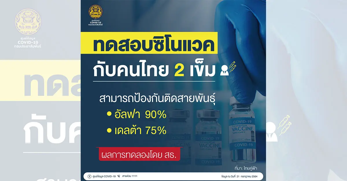 โควิดเดลต้า – สธ.เผยผลทดสอบฉีดวัคซีน “ซิโนแวค” 2 เข็ม ใน 3 จังหวัด ป้องกันเชื้อ โควิดเดลต้า ได้ถึง 75% ร่วมถึงข้อมูลจากกรมควบคุมโรค