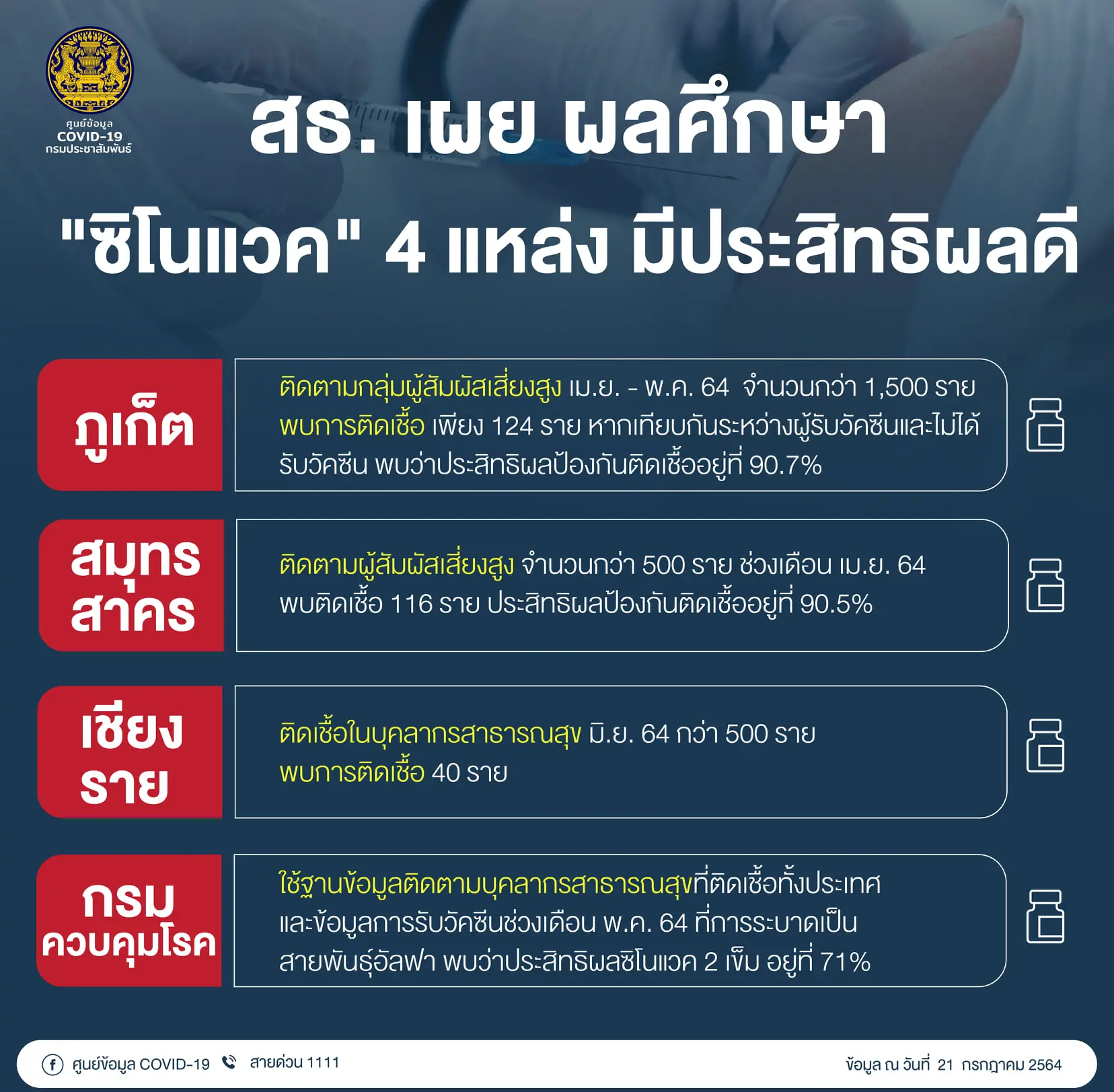 ล่าสุด เมื่อวันที่ 21 กรกฎาคม 2564 ทางเพจเฟซบุ๊ก ศูนย์ข้อมูล COVID-19 ได้เผยข้อมูลเกี่ยวกับประสิทธิภาพของวัคซีนซิโนแวค ที่สามารถป้องกันเชื้อโควิดเดลต้า และ เชื้อโควิดอัลฟา จากการผลทดสอบทั้ง 3 จังหวัด ประกอบด้วย ภูเก็ต สมุทรสาคร และ เชียงราย อีกทั้งยังมีข้อมูลจากกรมควบคุมโรคอีกด้วย