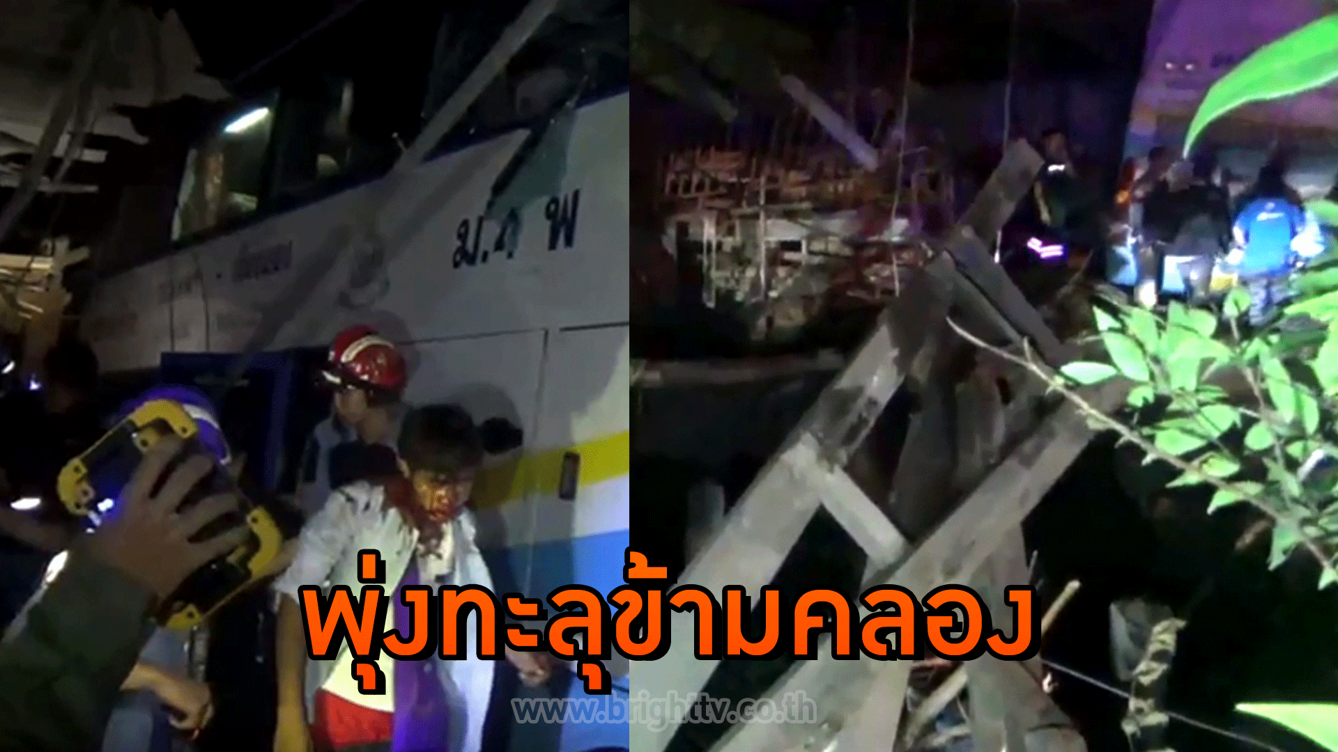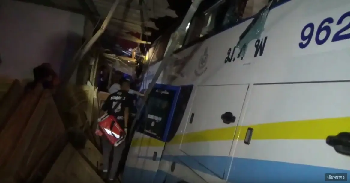 รถทัวร์เสียหลัก พุ่งทะลุข้ามคลอง ชนร้านขายเฟอร์นิเจอร์ 2 ร้านที่อำเภอสูงเม่น ผู้โดยสารเจ็บ 14 ราย