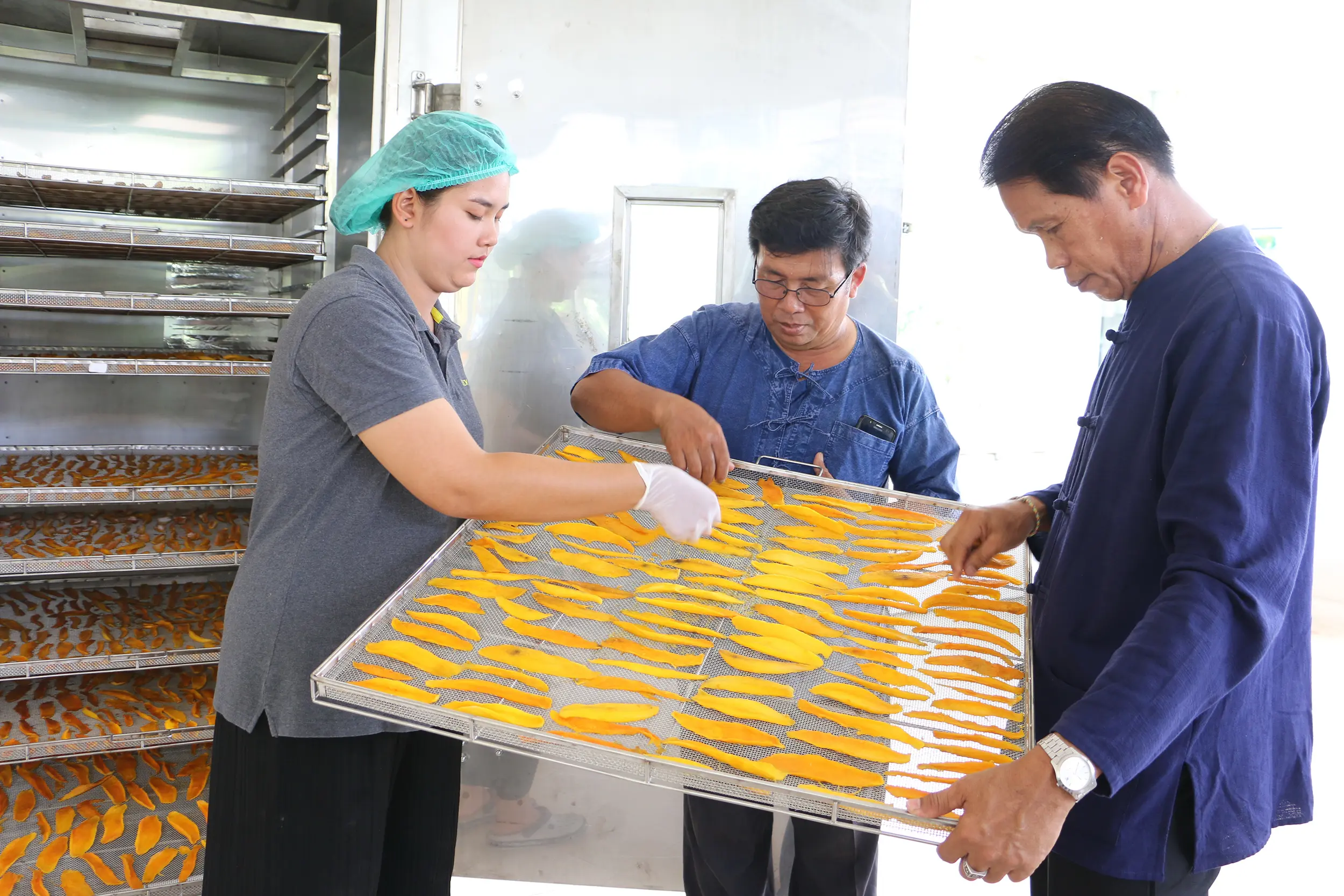 โดยน้องก้อย เล่าว่า ปัจจุบันนี้มะม่วงมหาชนกราคาเหลือแค่กิโลกรัมละ 6 บาท แต่ถ้าเป็นมะม่วงแก่สุกคาต้นที่ผิวมีตำหนิจากในสวน ซึ่งถ้านำไปขายก็จะได้แค่กิโลกรัมละ 1-2 บาท จึงตัดสินใจนำมะม่วงที่แก่สุกคาต้นมาปอกเปลือก และฝานเป็นชิ้นนำไปทำเป็นมะม่วงอบแห้ง โดยใช้เวลาอบในตู้อบ 15 ชั่วโมง ถ้ามะม่วง 10 กิโลกรัม จะทำเป็นมะม่วงอบแห้งได้ 1.5 กิโลกรัม ขายในกิโลกรัมละ 300 บาท