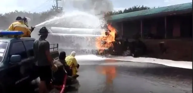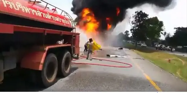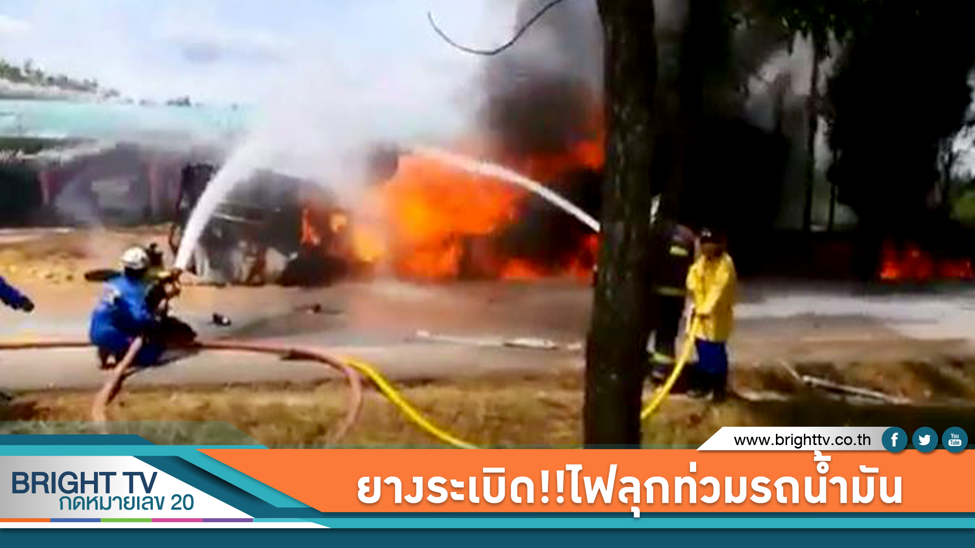 รถบรรทุกน้ำมันเกือบ 2,000 ลิตรยางระเบิด เสียหลักไถลไปชนรถจักรยานยนต์ พลิกคว่ำ ก่อนไฟลุกท่วม คนขับและเด็กรถกระเด็นออกมาเสียชีวิตคาที่ 2 ราย