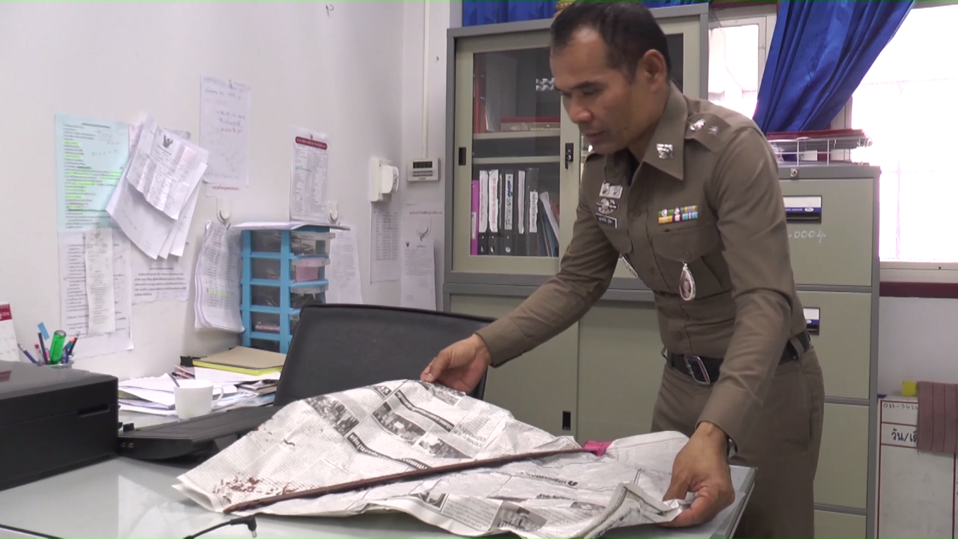 จากการสอบสวน ทราบว่า ก่อนเกิดเหตุผู้ต้องหาได้นั่งดื่มสุรากับเพื่อนอยู่ที่บริเวณหน้าบ้านพัก ต่อมาผู้ต้องหาได้ก่อเหตุทำร้ายเพื่อนที่ร่วมวง ทำให้มารดาออกมาห้ามปราม แต่ก็ไม่สามารถห้ามได้ จึงได้ไปตามสามีมาช่วยห้ามปรามลูก แต่ปรากฏว่าผู้ต้องหาไปเอามีดดาบที่ซ่อนไว้อยู่บริเวณใกล้ๆ ฟันไปที่มารดาของตนเองจนแขนซ้ายเอ็นขาดเป็นแผลลึก เมื่อผู้ตายเห็นดังนั้นก็เข้าไปช่วยภรรยา ทำให้ผู้ต้องหาใช้มีดฟันไปถูกที่ปลายนิ้ว ผู้ตายจึงวิงหนีเอาชีวิตรอด แต่ผู้ต้องหาไล่ตามไปฟันเข้าที่ไหล่จนล้มลงแล้วฟันซ้ำเข้าที่ลำคอเสียชีวิตคาที่
