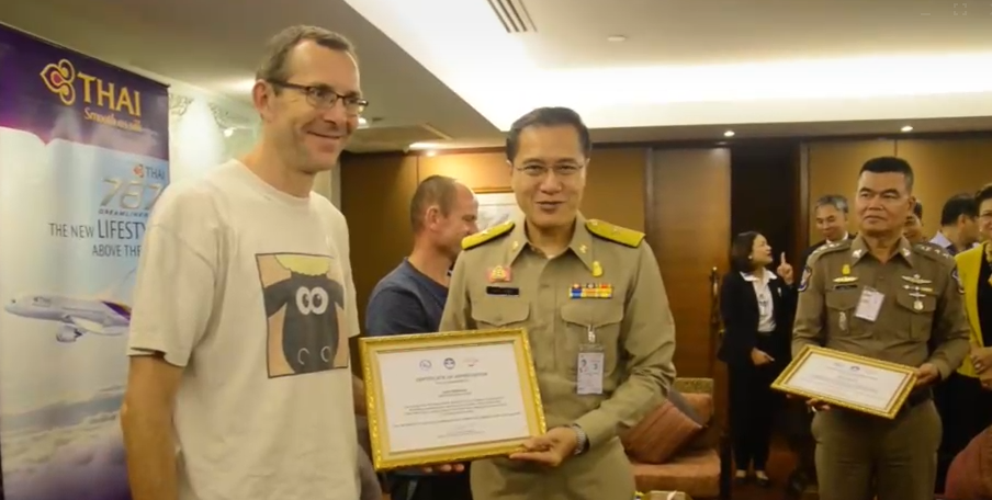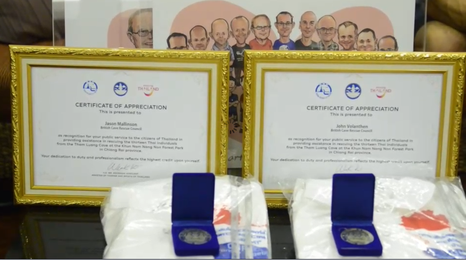 ก่อนที่จะขึ้นเครื่อง นายวีระศักดิ์ ได้เกียรติบัตร ให้กับทั้ง 2คน เพื่อแสดงความขอบคุณที่เดินทางมาร่วมช่วยในภารกิจครั้งนี้ รวมทั้งมอบภาพวาด 3 ผู้เชี่ยวชาญการดำน้ำในถ้ำชาวอังกฤษ เพื่อเป็นที่ระลึก