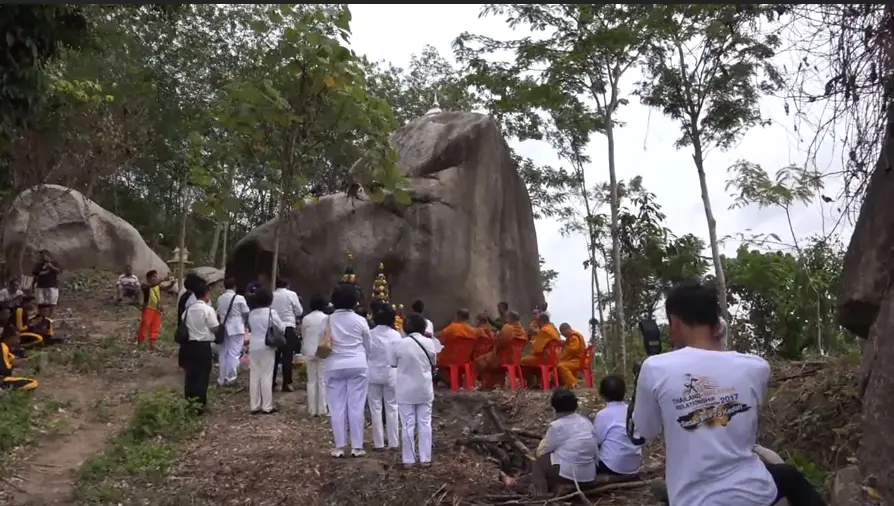 วันนี้ 21 กรกฎาคม 2560 ที่ หมู่ 3 บ้านประกอบ อ.นาทวี จ.สงขลา หลวงพ่อภัตร อริโย เจ้าอาวาสวัดนาทวี และเกจิดังภาคใต้ฉายา “เทพสามตา” พร้อมด้วยคณะ ได้จัดทำพิธีบวงสรวง ตั้งบายศรี พร้อมผลไม้ ขนมหวาน น้ำ ชุดใหญ่ เพื่อตั้งเจดีย์ บนก้อนหินขนาดใหญ่ ก่อนจะทำการบูรณะที่พักศพ และรอยเท้าหลวงปู่ทวด โดยมีนายขจรศักดิ์ เจริญโสภา รอง ผู้ว่าราชการจังหวัดสงขลา เป็นประธานฝ่ายฆราวาส ,นางวรรณี นวลแก้ว รักษาการ ผอ.สนง.พระพุทธศาสนา จ.สงขลา และนายกเทศบาลเมืองสะเดา นายก อบต.ในพื้นที่อีกหลายท่าน โดยมีหลวงพ่อภัตร อริโย เจ้าอาวาส,เกจิดังภาคใต้ เป็นประธานฝ่ายสงฆ์ ในขณะที่กำลังทำพิธีอยู่นั้น ก็ได้มีงูเขียว จำนวนสองตัว ได้ออกมาชูคอที่บริเวณหน้าที่พักศพหลวงปู่ทวด จนเสร็จพิธี งูเขียว จึงเลื้อยหายไป สร้างความอัศจรรย์ใจกับคณะที่เข้าร่วมในพิธีเป็นอย่างมาก ต่างพากันวิพากษ์วิจารณ์ ว่างูเขียว เป็นตัวแทนของพญานาค มาร่วมในพิธีดังกล่าว ซึ่งบางคนก็ตีเป็นเลขหวย เพื่อนำไปซื้อสลากกินแบ่งรัฐบาลต่อไป