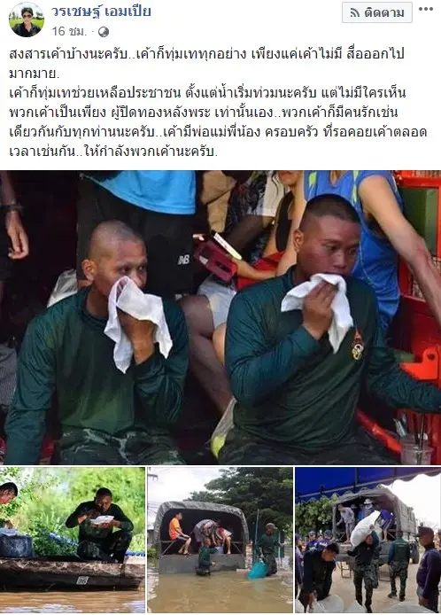 วานนี้ (19 ก.ย.) วรเชษฐ์ เอมเปีย มือกลองวง สไมล์ บัฟฟาโล่ ได้โพสต์ข้อความให้กำลังใจทหารที่ช่วยน้ำท่วมผ่านเฟซบุ๊กส่วนตัวชื่อ “วรเชษฐ์ เอมเปีย” ระบุว่า..