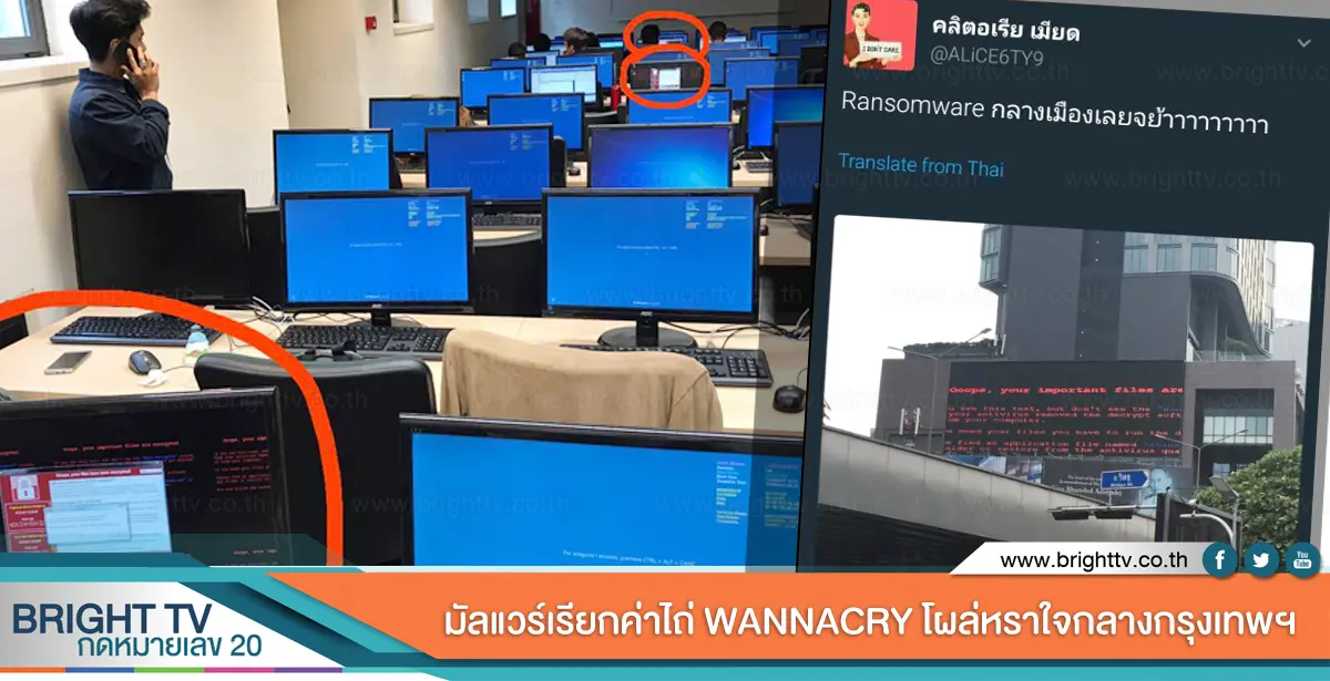 ล่าสุดมีกระแสในโลกโซเชี่ยลจากผู้ใช้งานทวิตเตอร์ที่ชื่อ คลิติเรีย เมียด @ALiCE6TY9 เป็นภาพถ่ายป้ายโฆษณาระบบดิจิตอลขนาดใหญ่บริเวณถนนวิทยุใจกลางกรุงเทพมหานครที่ติดไวรัส WannaCry พร้อมระบุว่า “Ransomware กลางเมืองเลยจย้าาาาาาาาา”