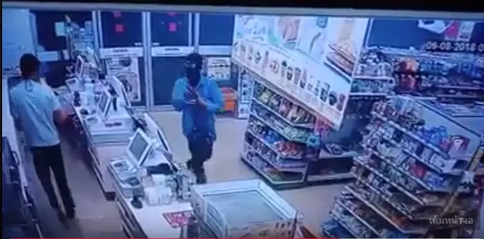 จากนั้นชักอาวุธปืนลูกโม่ไม่ทราบชนิด จ่อมาทางตนเองว่าอยู่นิ่งให้ใส่เงินในกระเป๋าสะพาย และเดินเข้ามาที่หลังเคาเตอร์และเดินออกไป ด้วยความกลัวจึงเปิดลิ้นชักที่มีเงินจำนวน 19,000 บาท ส่งให้คนร้าย แต่ด้วยคนร้ายร้อนล้นทำเงินตกคนร้ายลงก้มเก็บ 2 ครั้ง จากนั้นเดินหนีอย่างใจเย็นขึ้นรถ จักรยานยนต์ หนีออกไป โดยกล้องวงจรปิดในร้านสามารถบันทึกภาพไว้ได้