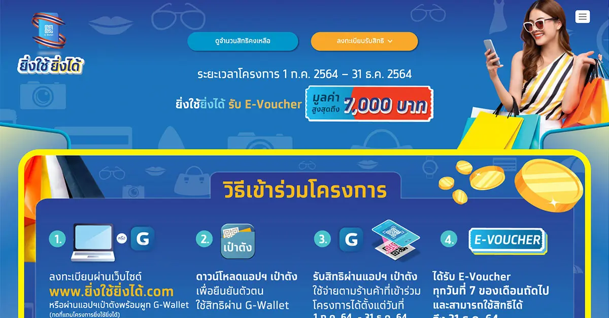 เริ่มแล้ววันนี้ ลงทะเบียน “ยิ่งใช้ยิ่งได้” 4 ล้านสิทธิ รับ E-Voucher สูงสุด 7,000 สำหรับผู้ที่มีกำลังซื้อ ยอดสะสมไม่เกิน 6 หมื่นบาท สามารถเช็กเงื่อนไขที่นี่