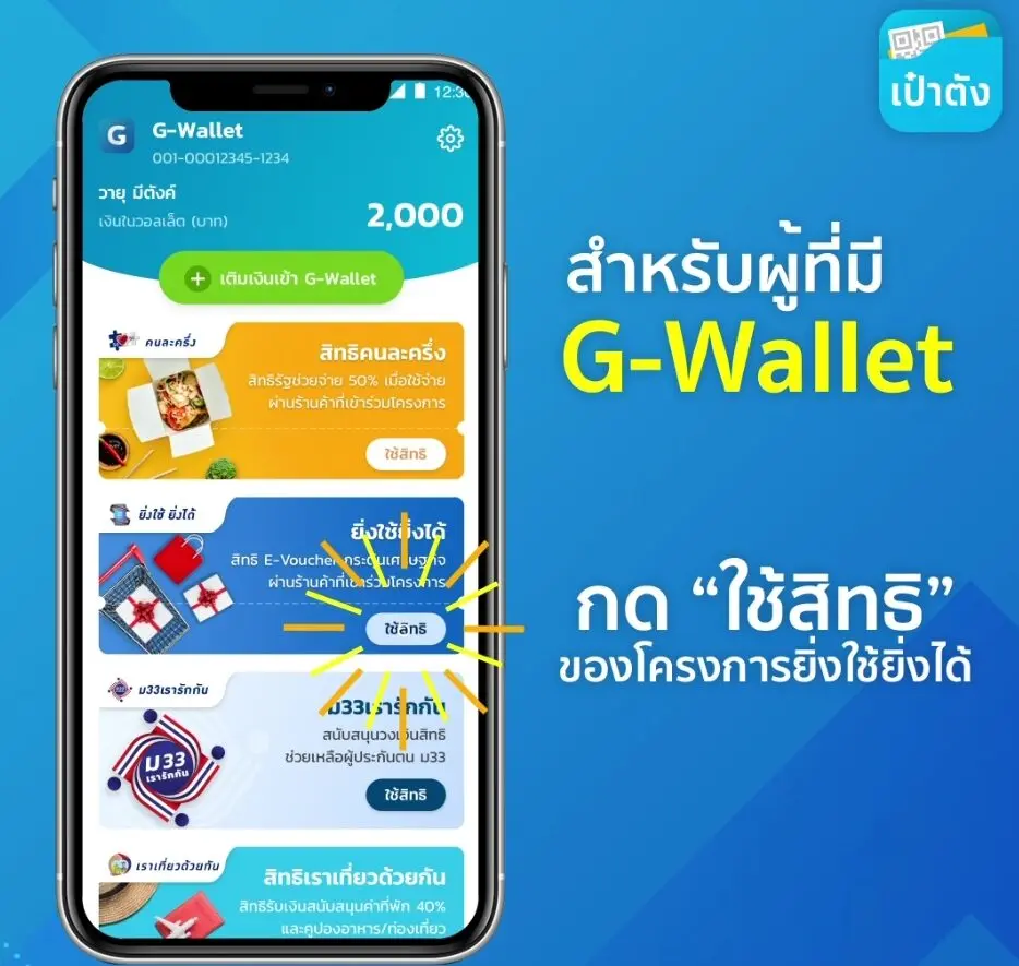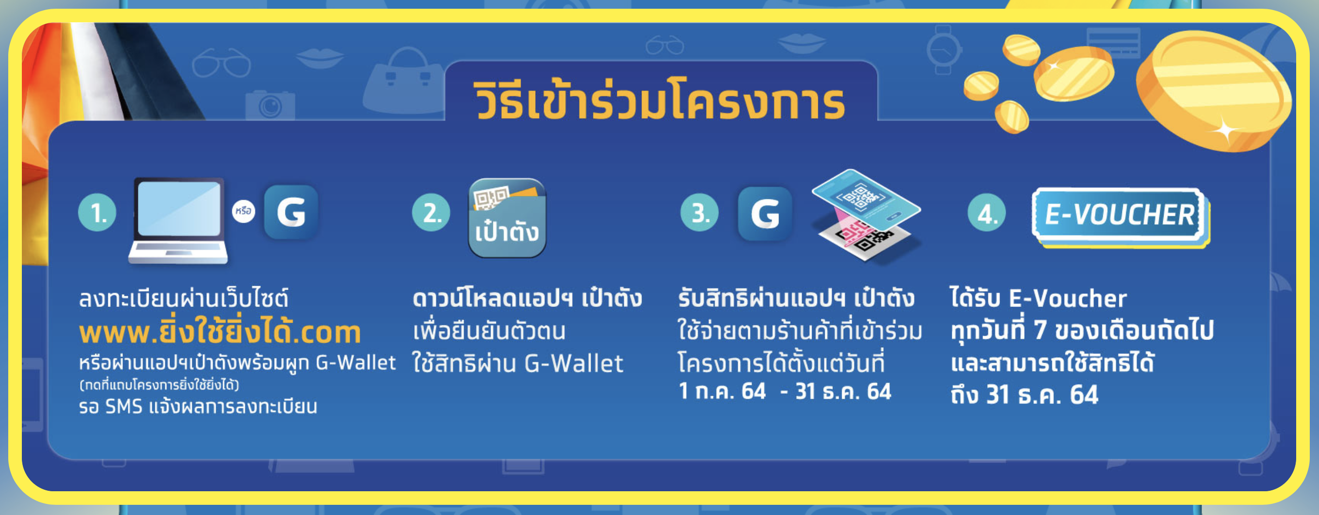 - วันที่ 21 มิถุนายน 2564 : เริ่งลงทะเบียนผ่าน www.ยิ่งใช้ยิ่งได้.com และ แอปฯ เป๋าตัง พร้อมผูก G-Wallet