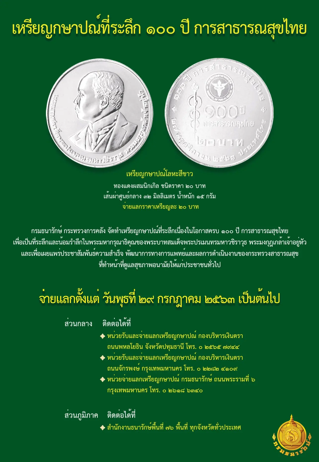 ทั้งนี้ สามารถสอบถามรายละเอียดเพิ่มเติมได้ที่กองบริหารเงินตรา โทร. 0-2565-7944 และ Call Center กรมธนารักษ์ โทร. 0-2059-4999 หรือ www.treasury.go.th